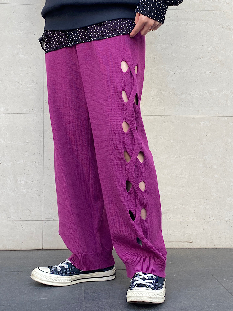 着心地:サイドの編み目が特徴的なパンツ。これからの季節は素肌を見せて着て頂くのがおすすめ。とても柔らかいニットで履き心地もとても良いです。