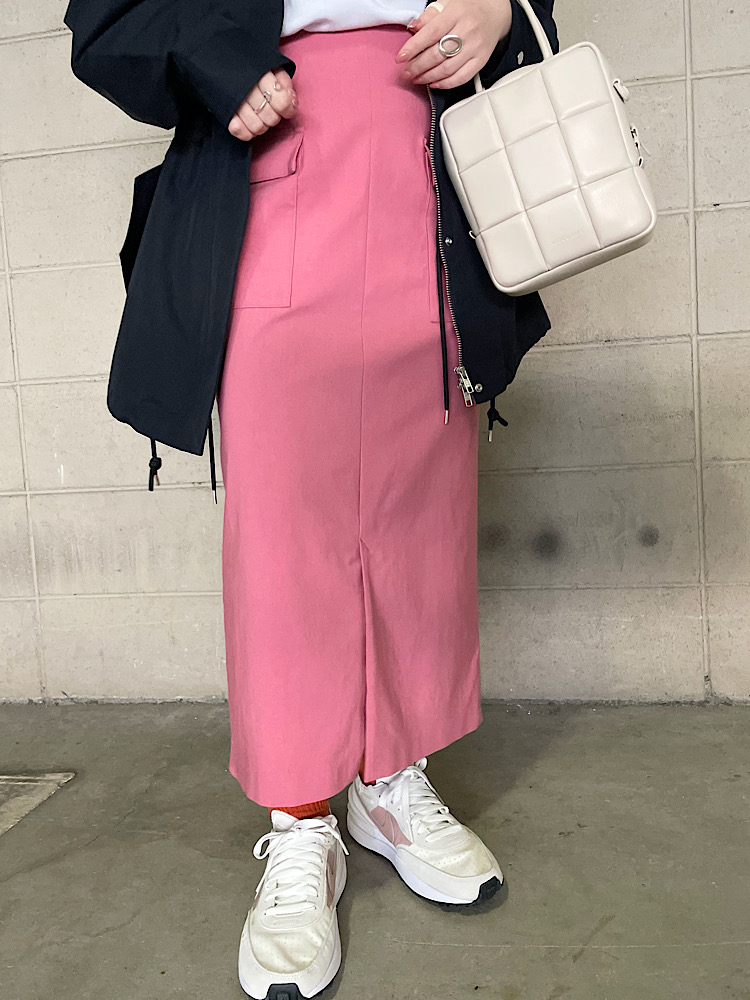 商品紹介:ストレッチがかなりきいているのでタイトなシルエットでも窮屈感が全くなく楽に履いていただけます。前スリットなのも着ていただきやすいデザインです。