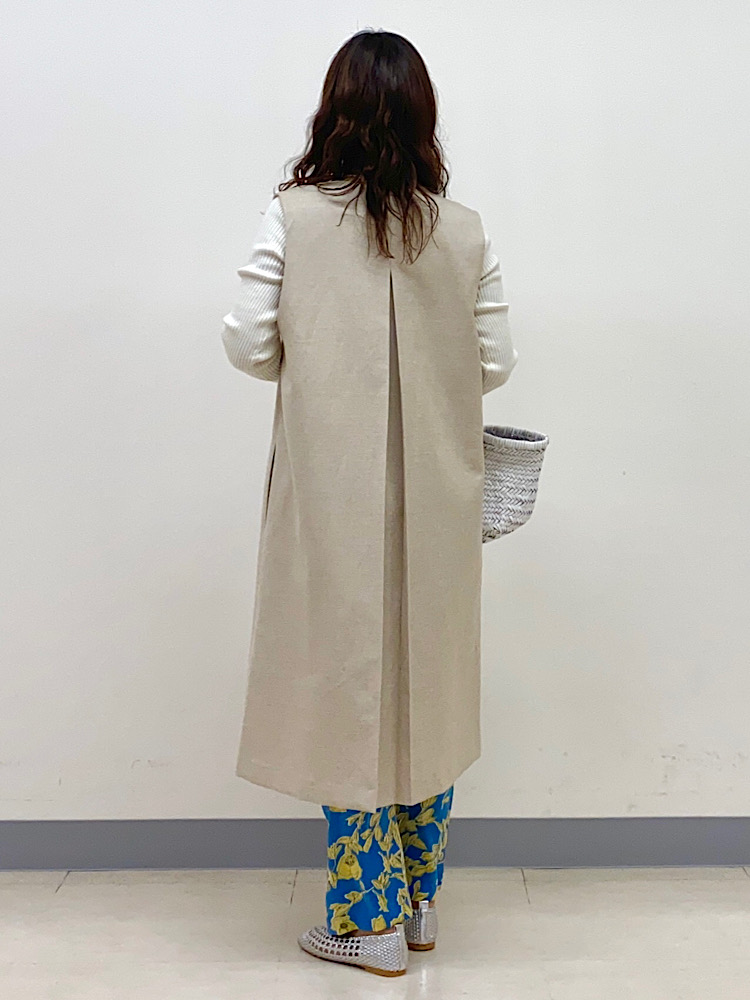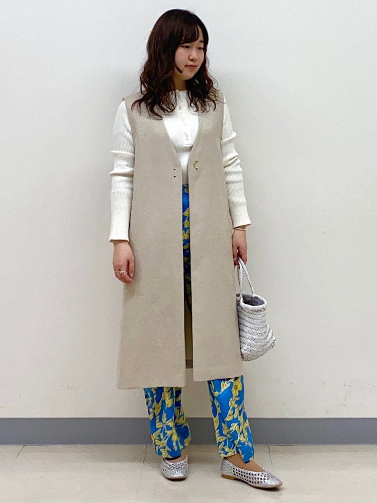 大ぶりな柄のパンツにはロングジレを合わせて大人なコーディネートに。