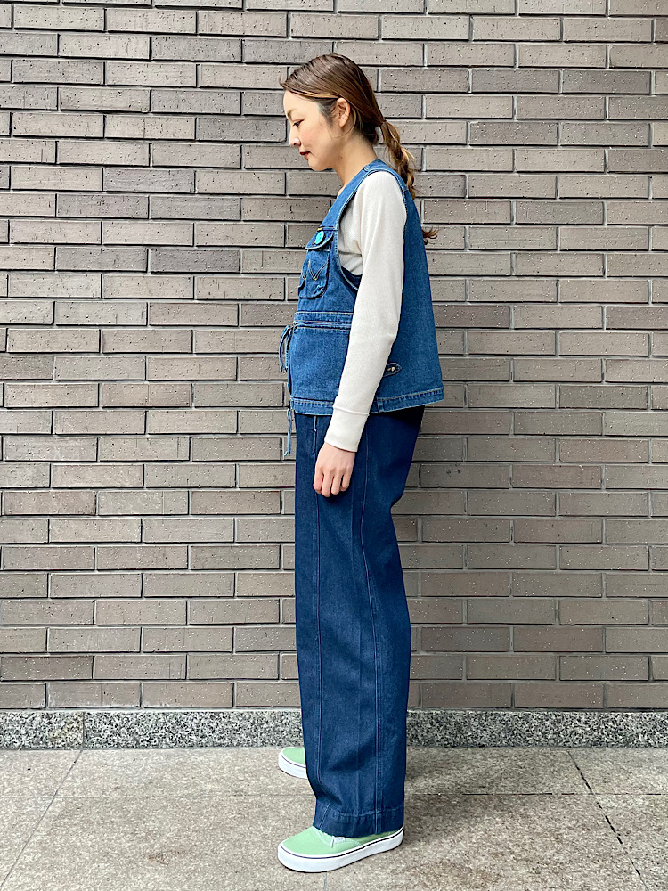 素材感・着心地:柔らかいデニム素材。インナーに合わせ、肩ひもの長さを調整できます。腰からストンと落ちるワイドなシルエットです