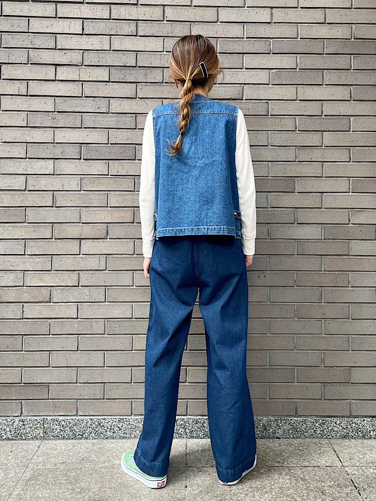 素材感・着心地:柔らかいデニム素材。身幅、袖周りにゆとりがある為、インナーを選ばず着用できます