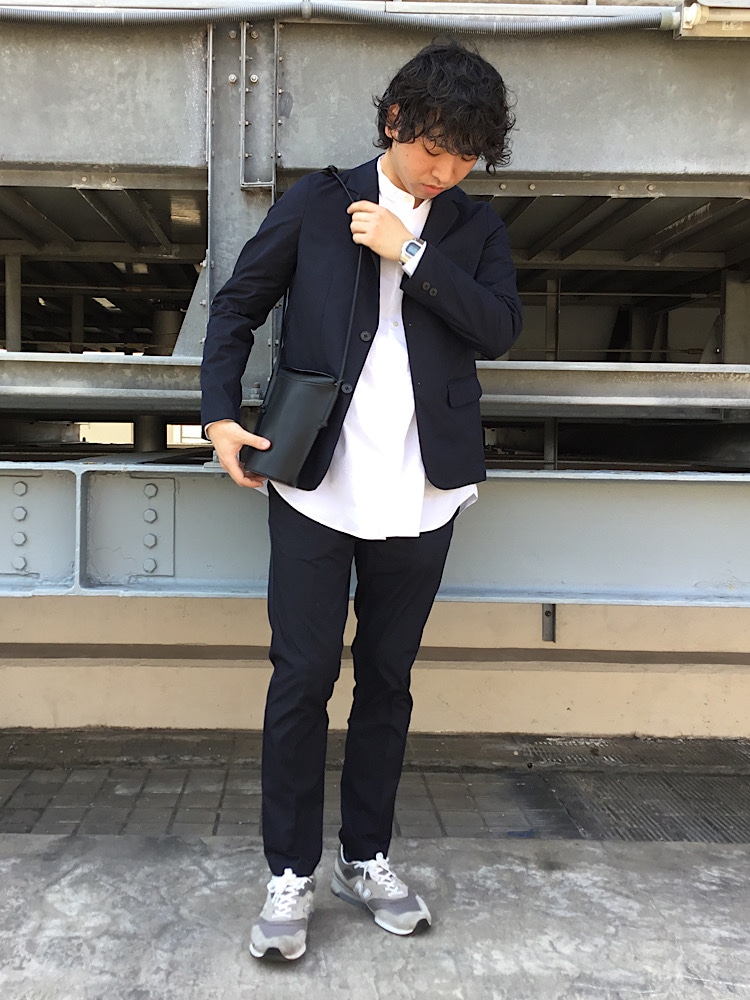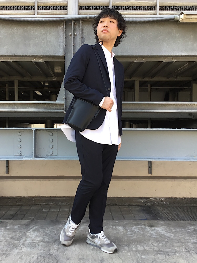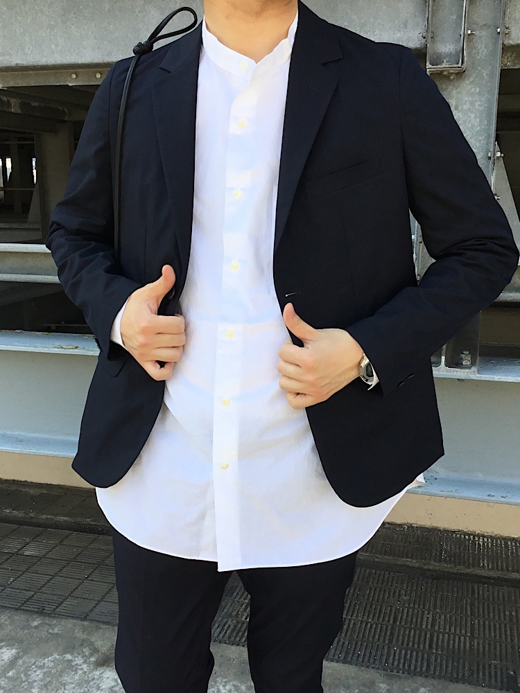 今回はオールシーズン着ていただけるセットアップスーツにシンプルな白のバンドカラーシャツを合わせてます!ネイビーのセットアップは幅広いシーンで活躍するのでオススメです!