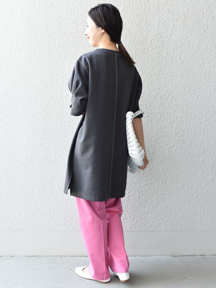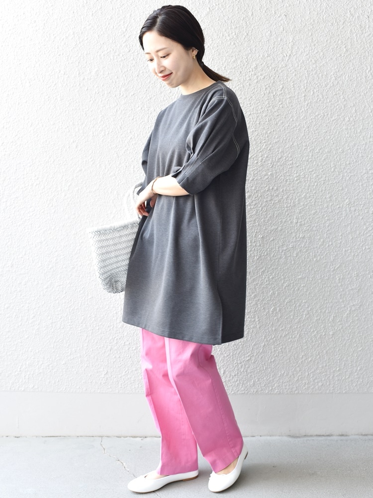 サイズ感:身幅はゆったりめのサイズ感。袖丈は肘くらいの長さです。ヒップがすっぽりと隠れる着丈で安心感があります。
