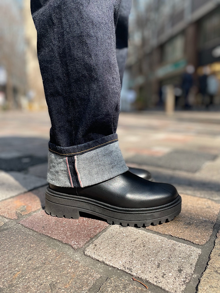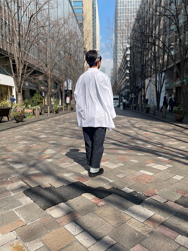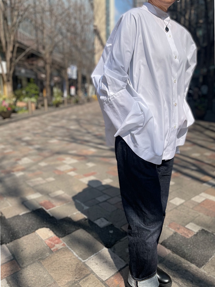 コットン・ポプリン素材のビッグシルエットシャツ。ベルスリーブがポイント。12ozセルビッチデニムをシャツとのバランスを考えサイズアップして着用。 デニムと相性の良いボリュームあるチェルシーブーツ をコーディネート。