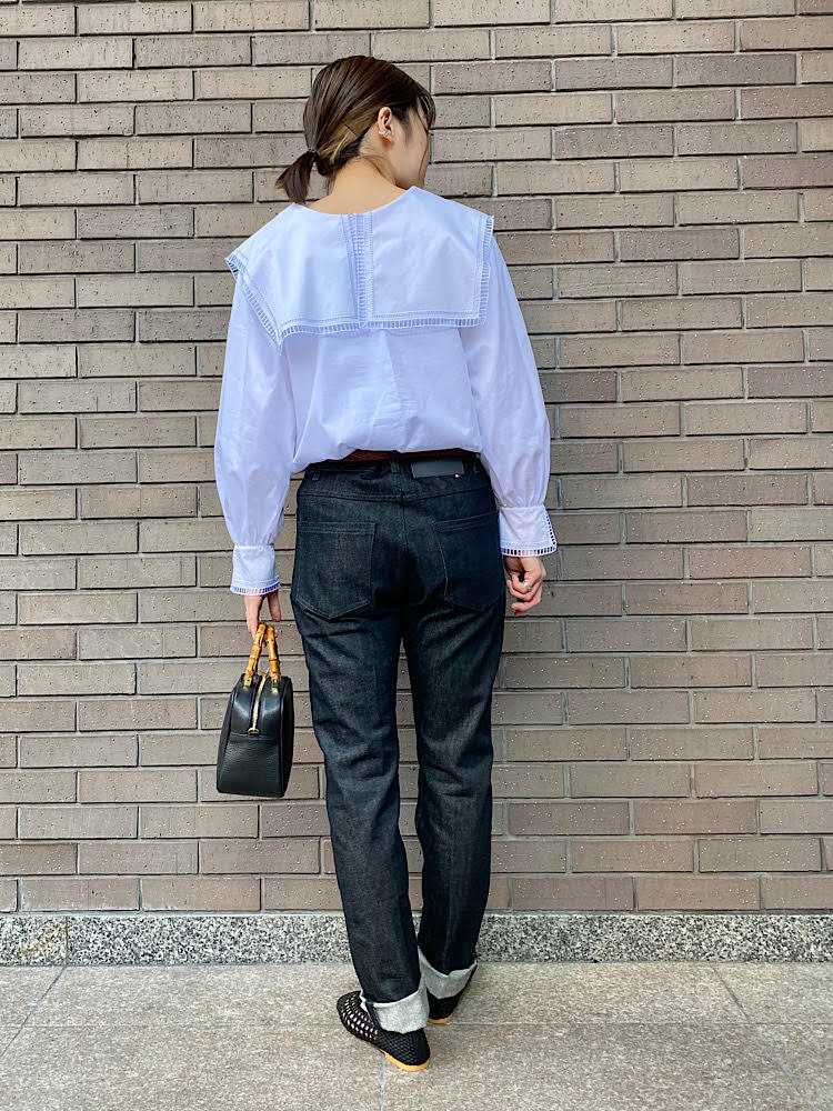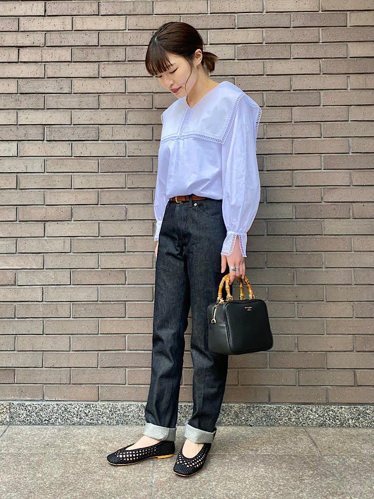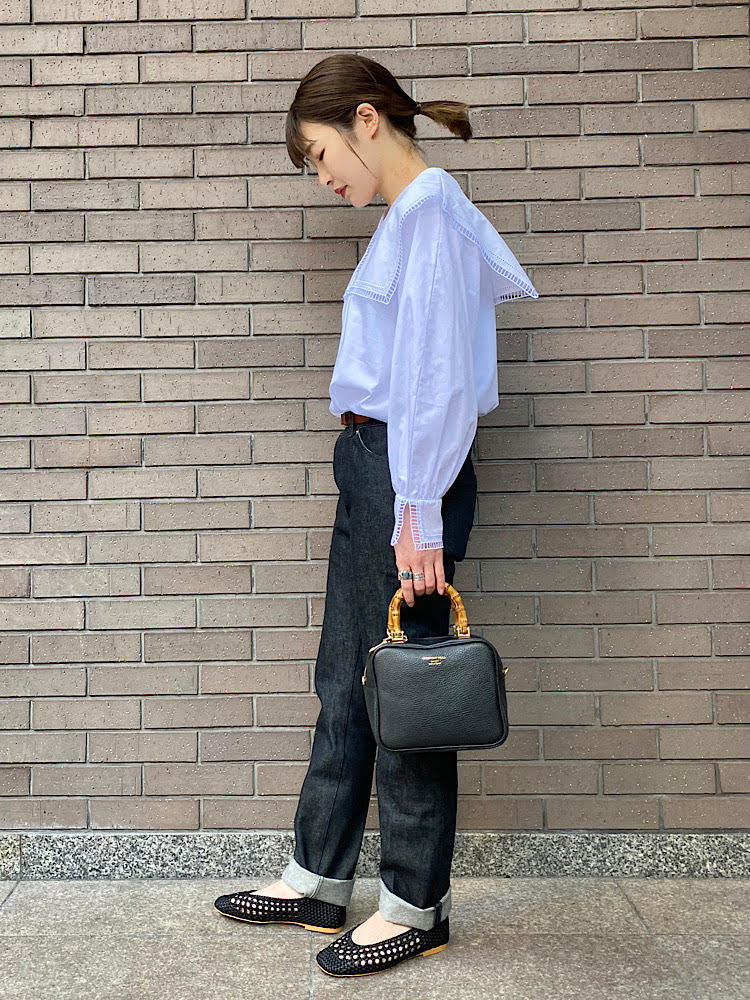 襟ブラウスにデニムを合わせたきれいめカジュアルなコーディネート