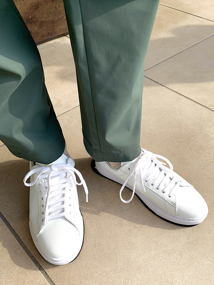 着心地:もも周りにゆとりがあり動きやすいです。裾にかけてテーパードが効いており綺麗なシルエットです。