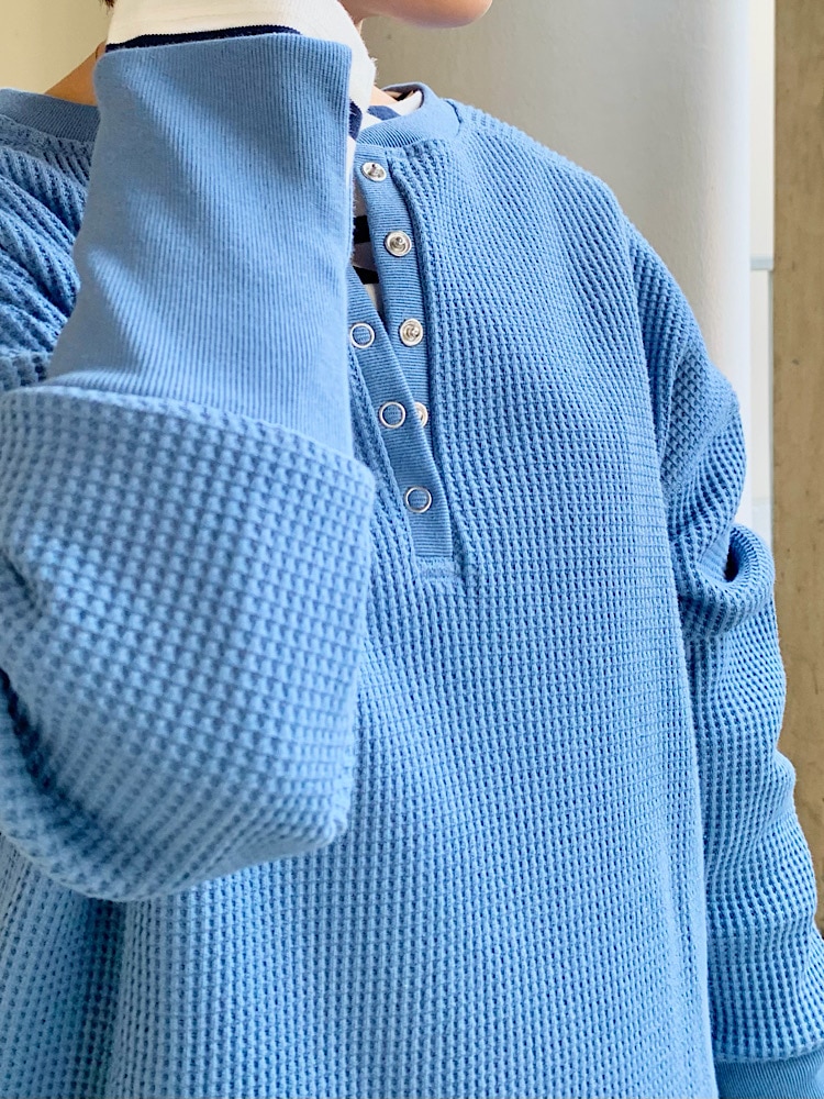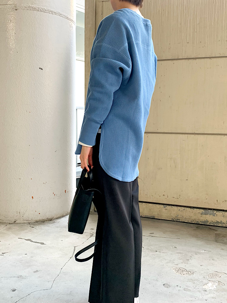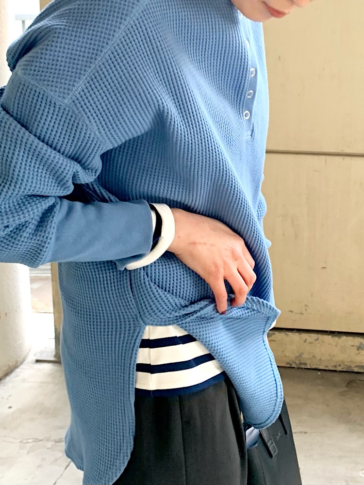 着心地:しっかりめのワッフル素材です。硬すぎることはなく重ね着などもしやすいです。