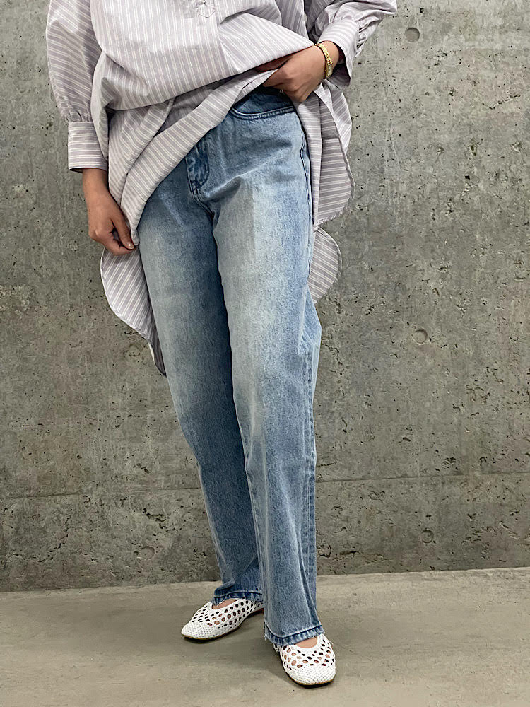 サイズ感:ややコンパクト。ハイウエスト気味でストレートシルエット。丈は長すぎないので小柄な型にもおすすめ。