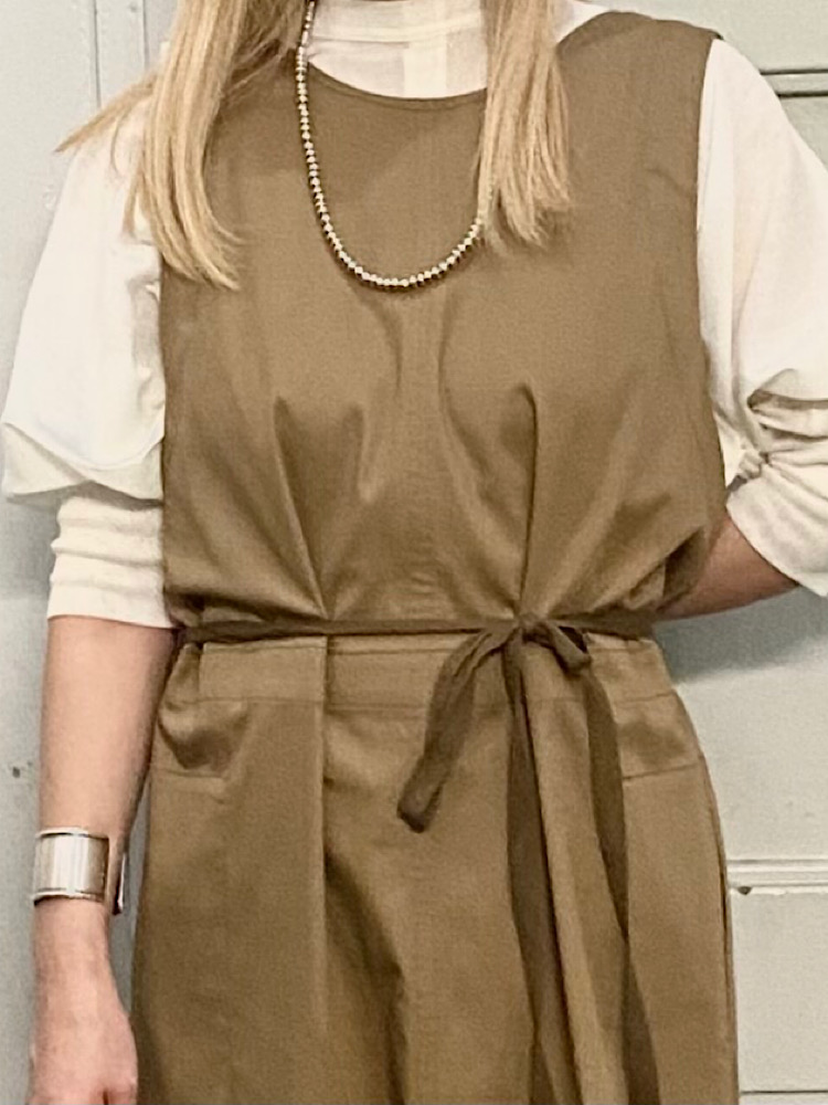 素材感・着心地:コットン、リネンの素材で前後で着用可能。綺麗目ブラウスやロンTなど色々なコーディネートが楽しめそうです。