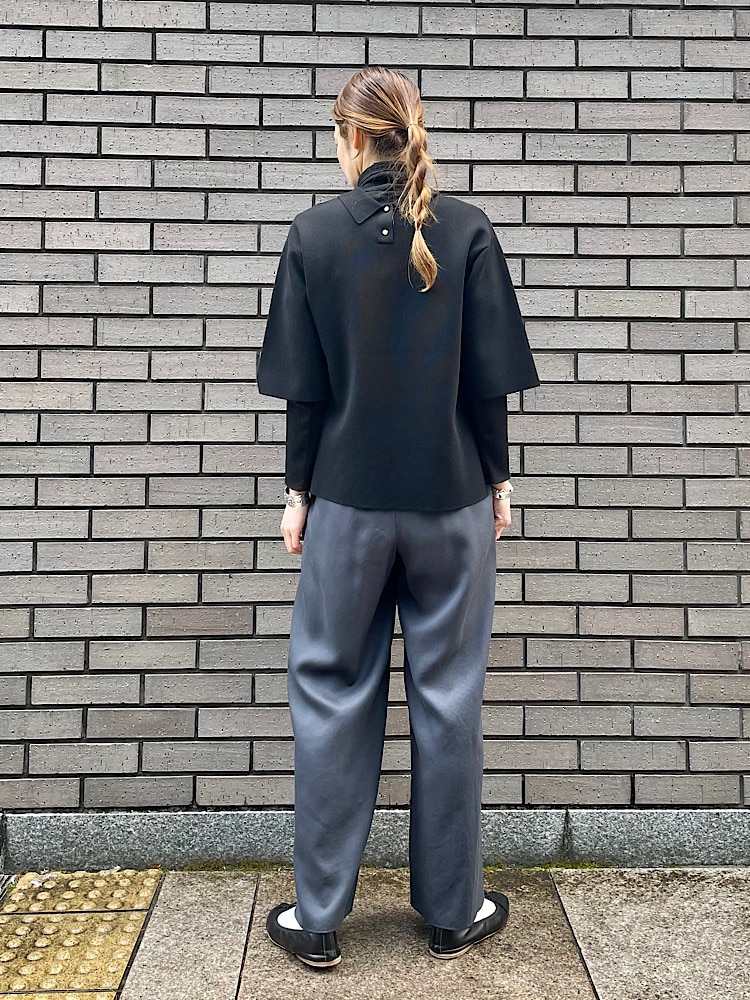 素材感・着心地:セルロース/ナイロンのさらりとした素材感。太さはありますが落ち感がある為、スッキリと見えるシルエットです