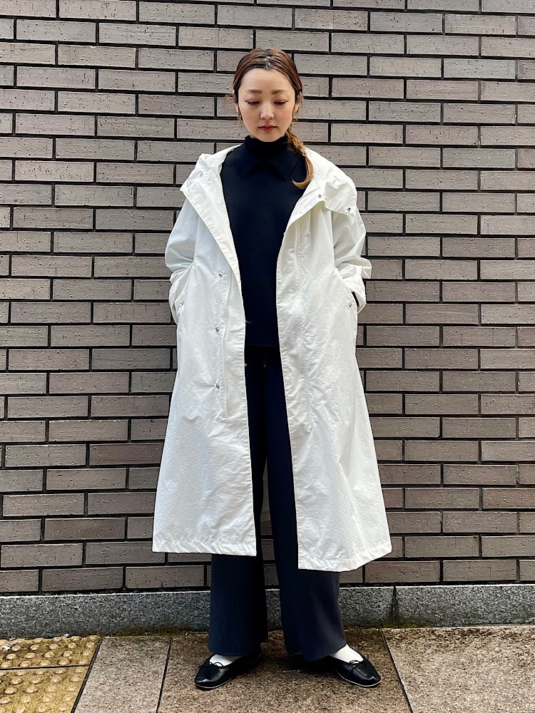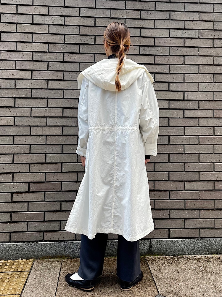 素材感・着心地:コットン/ナイロンの少しハリのある素材感。裏地は付いていませんが全体的にゆったりとしたシルエットなので、インナーを選ばず着用できます。サイドのスリットもポイントです