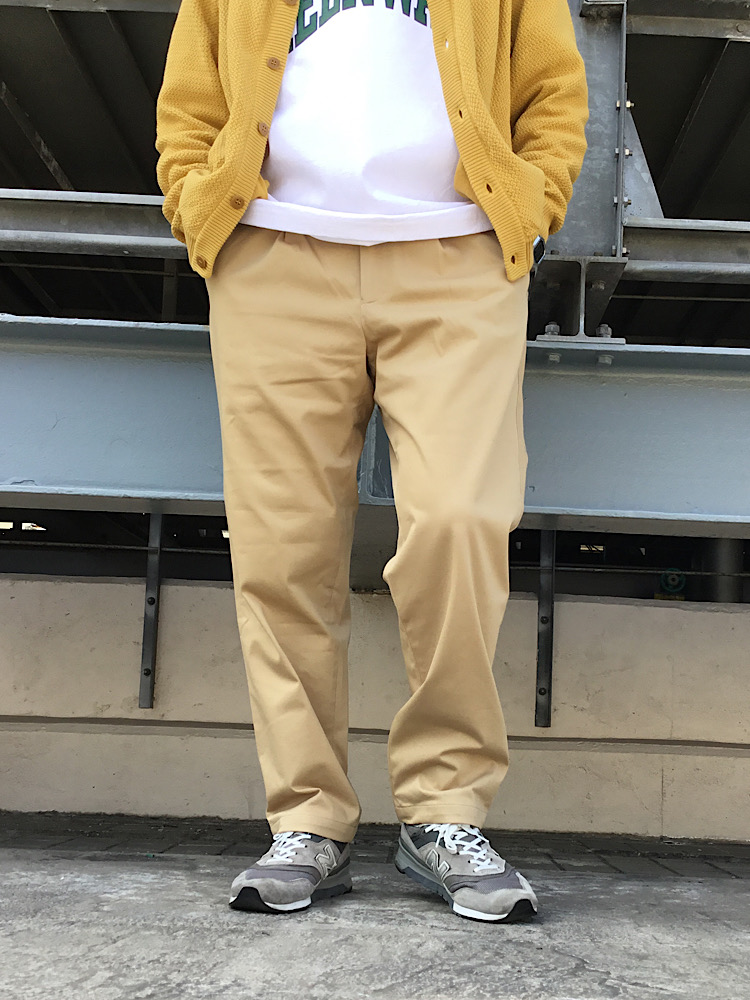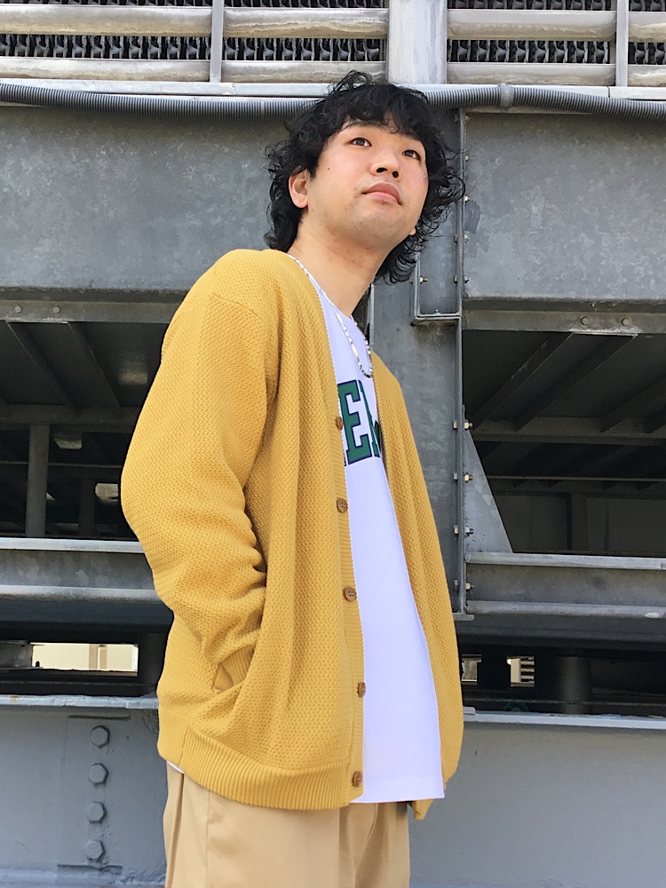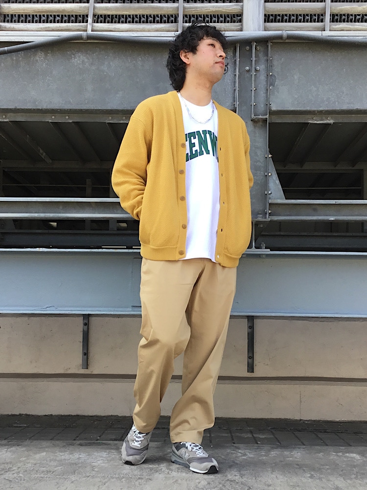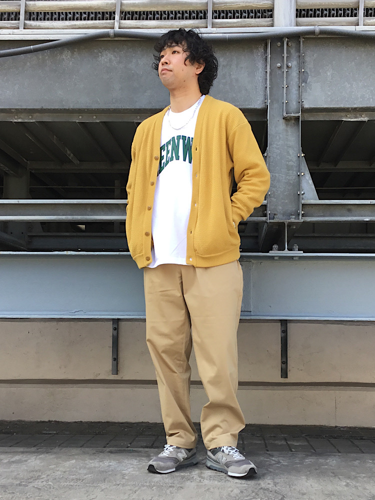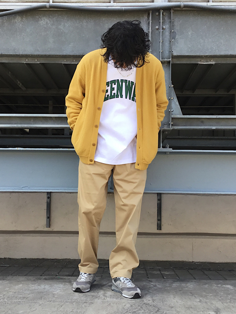 今回は新作SKOOKUMのカーディガンを羽織ってWONDER SHAPE生地のジャージパンツを合わせたコーディネートです。この生地のパンツは360度ストレッチ機能があり、非常に履きやすいです。是非店頭でもお試し下さい。