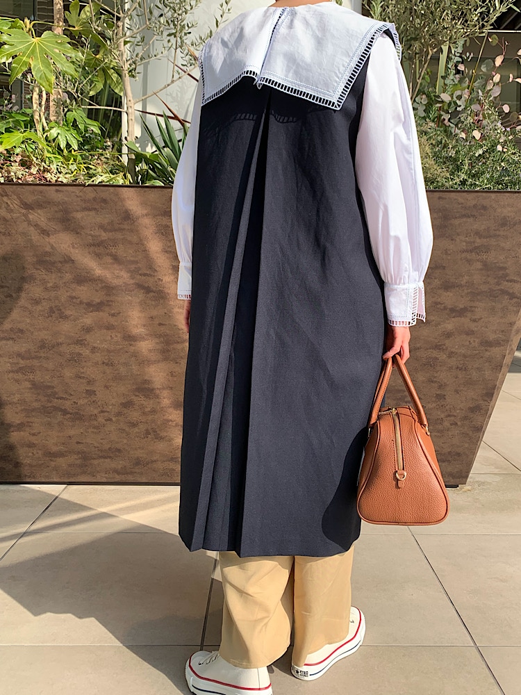 サイズ感:肩・身幅、肩まわりゆったりめ。着丈も長めではありますが小柄な方でもバランスの取りやすい丈感だと思います。