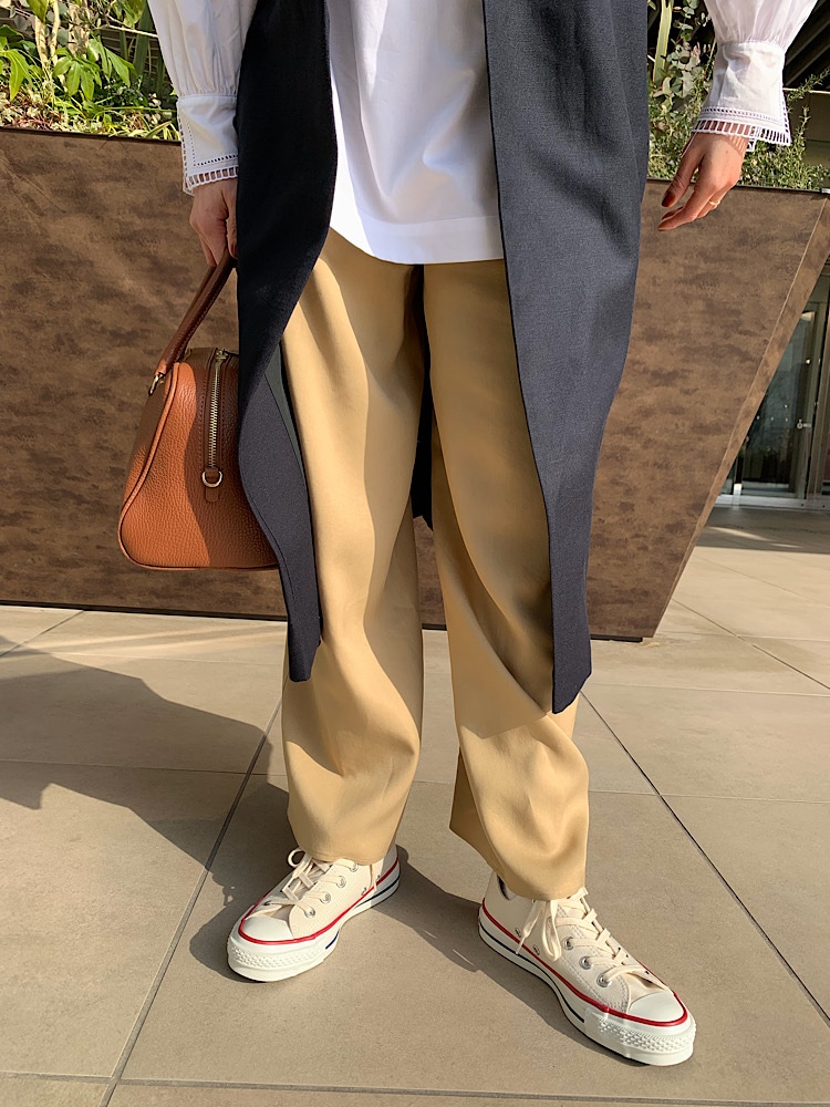 着心地:サラリとした肌あたりの良い春夏向けの素材です。透けることもなく安心して穿けます。落ち感があり脚のラインが気にならないシルエットです。