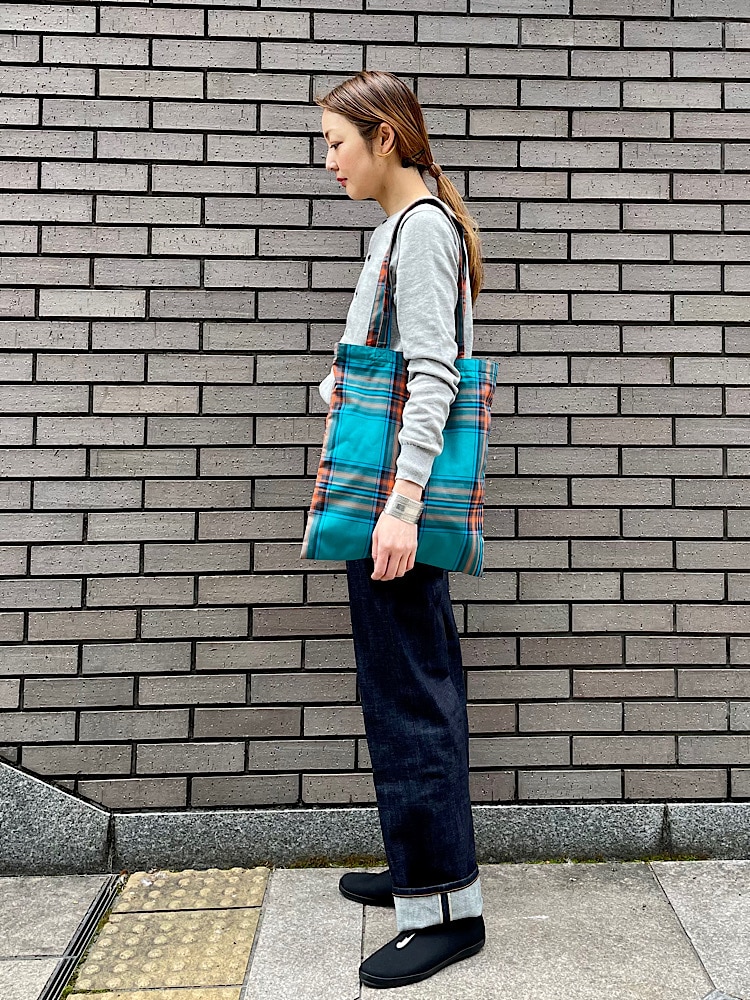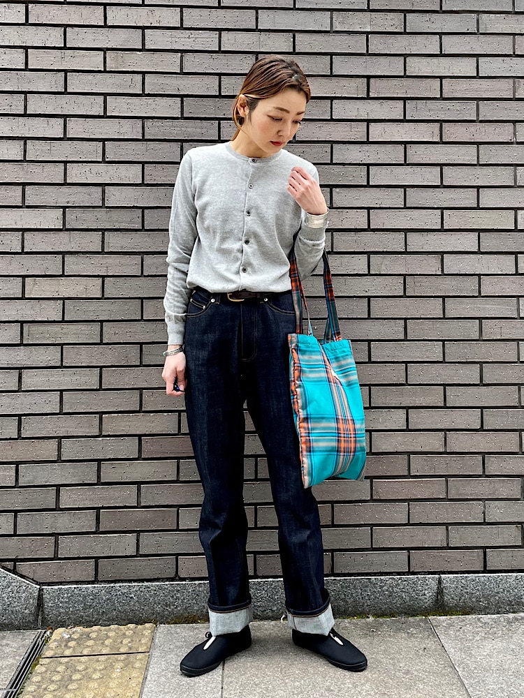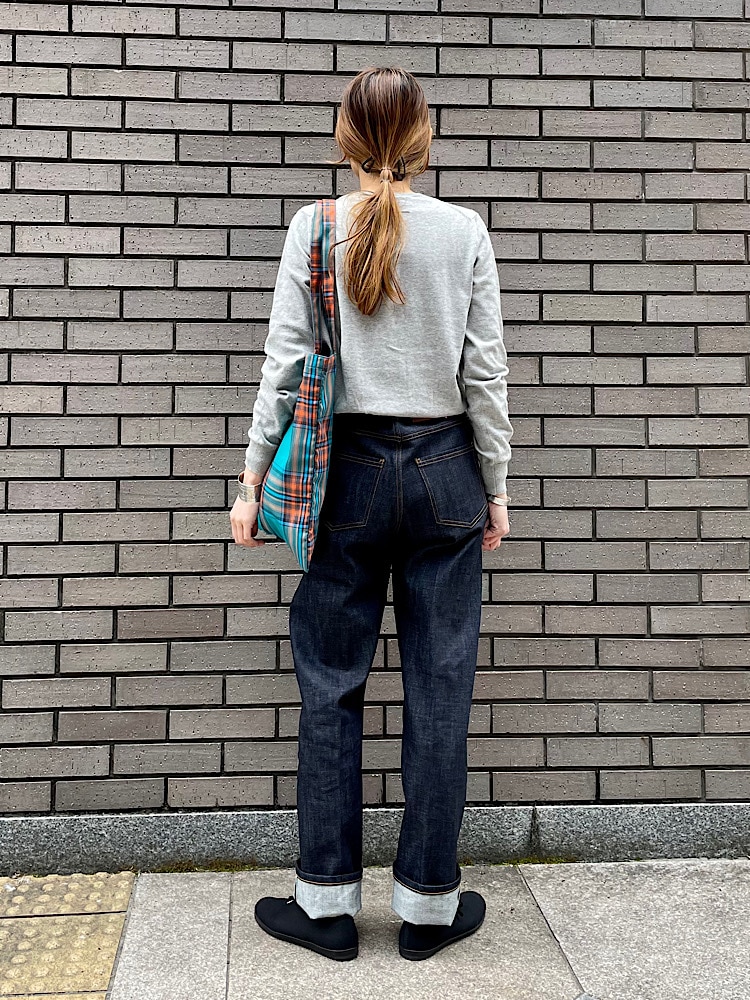 素材感・着心地:コットン素材のデニムです。見た目ほど厚みはありません。ウエストが大きめなのでベルトで絞るとストンと落ちる綺麗なシルエットになります