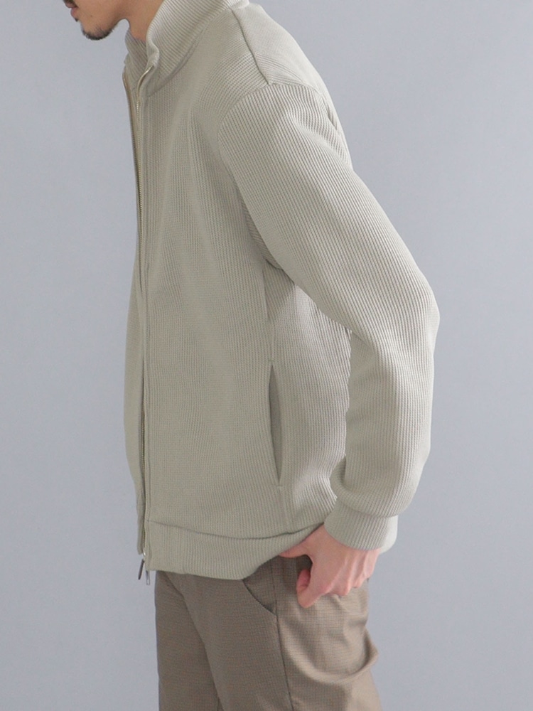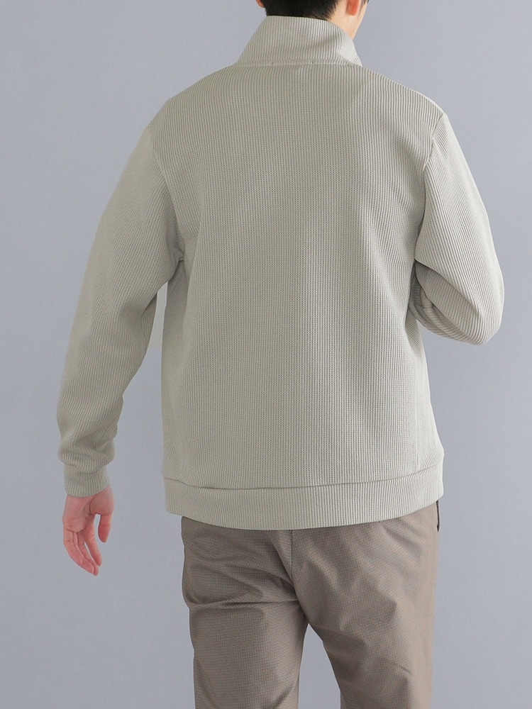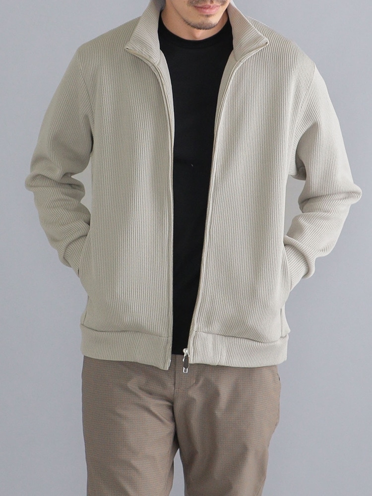 ジャケット感覚で羽織れるスタンドジップカーディガンを使用したコーディネート。