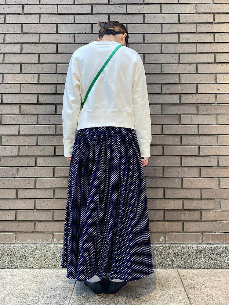 甘くなりすぎないよう、トップスは短丈のスウェットにして