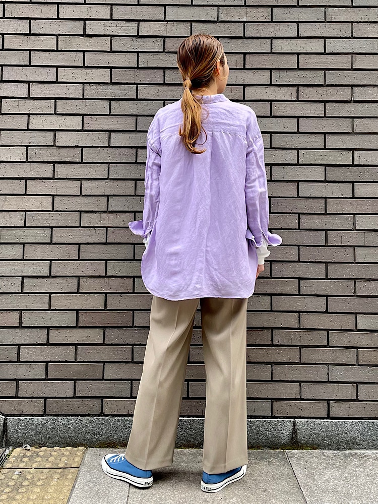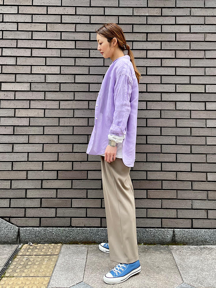 素材感・着心地:麻/再生繊維の柔らかい素材。ハリ感はありません。インナーに長袖を重ねている為、38を着用しています
