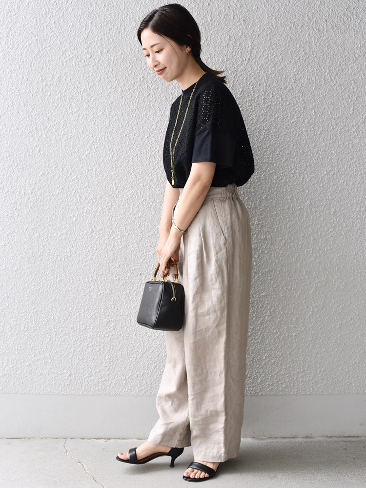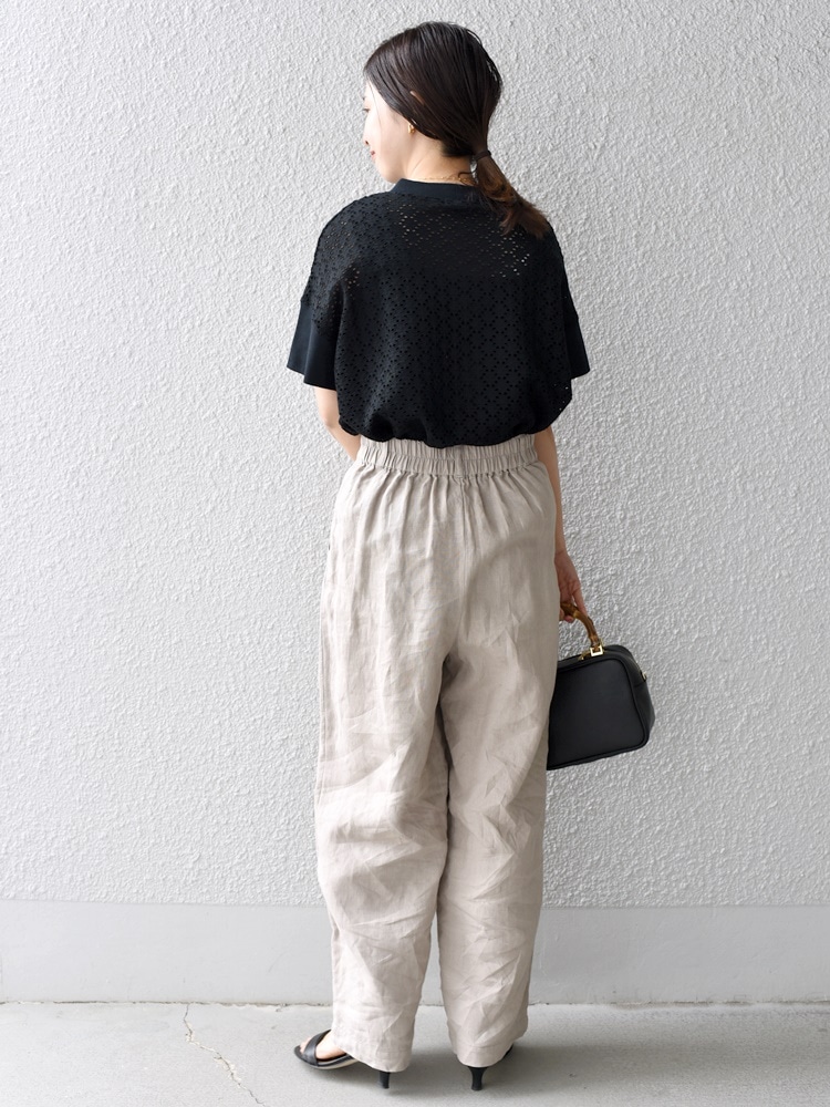 リラックス感のあるリネンパンツ合わせで、メリハリのあるコーディネートに。