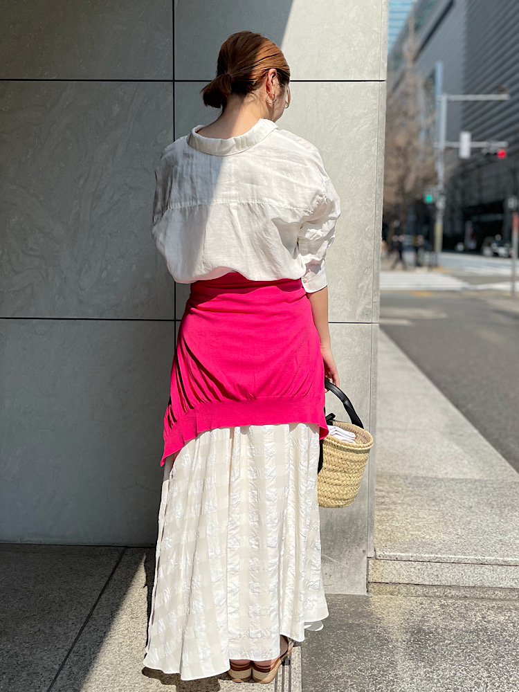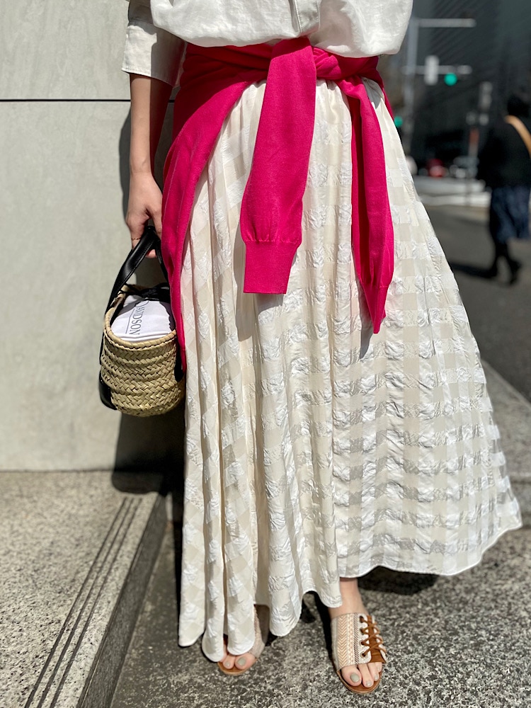 着心地:軽くて柔らかい着心地。風で揺れてくれる軽さがあるので女性らしいスカートです。程良いギンガムチェックの柄も控えめでトップスに柄物を持ってきてもOK