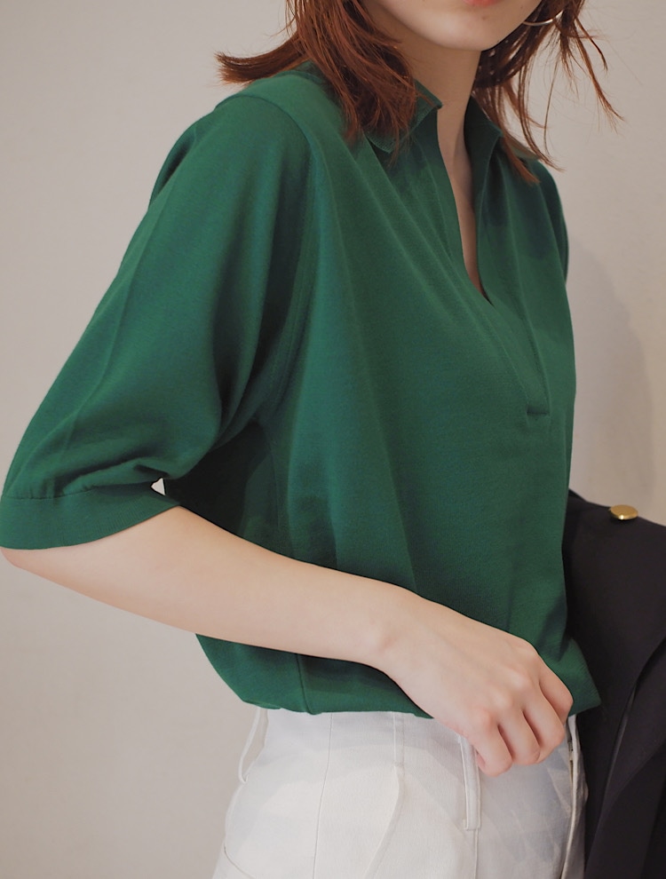とても滑らかで肌触りの良い綿素材です。胸元の開き具合が程よい肌見せでヘルシーさもありとても素敵な一着です。