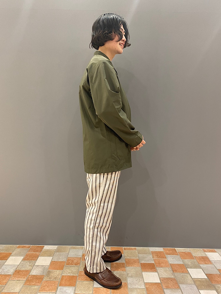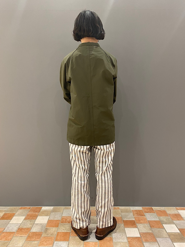 【素材感・着心地】ポリエステル、コットン、麻、レーヨン素材です。麻特有のドライなタッチはありますが、綺麗目なアイテムになっています。ゆとりもあり、リラックスな雰囲気も出せると思います。