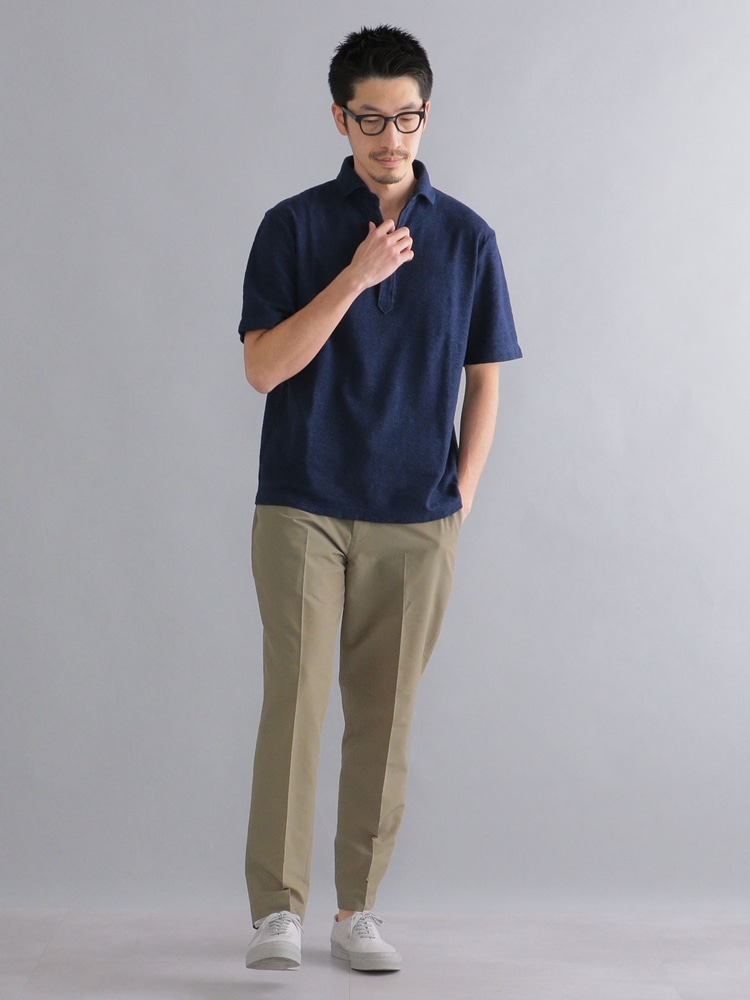 カジュアルに見えがちなオリーブのセットアップには、ネイビーのポロシャツでメリハリを。