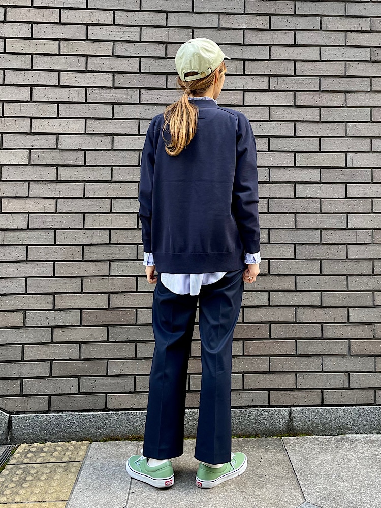 素材感・着心地:コットンのややハリのある素材。首元と長めの袖口に付いたフリルがポイントです。サイドにスリットも入っており、カットソーを重ねたレイヤードスタイルもおススメです