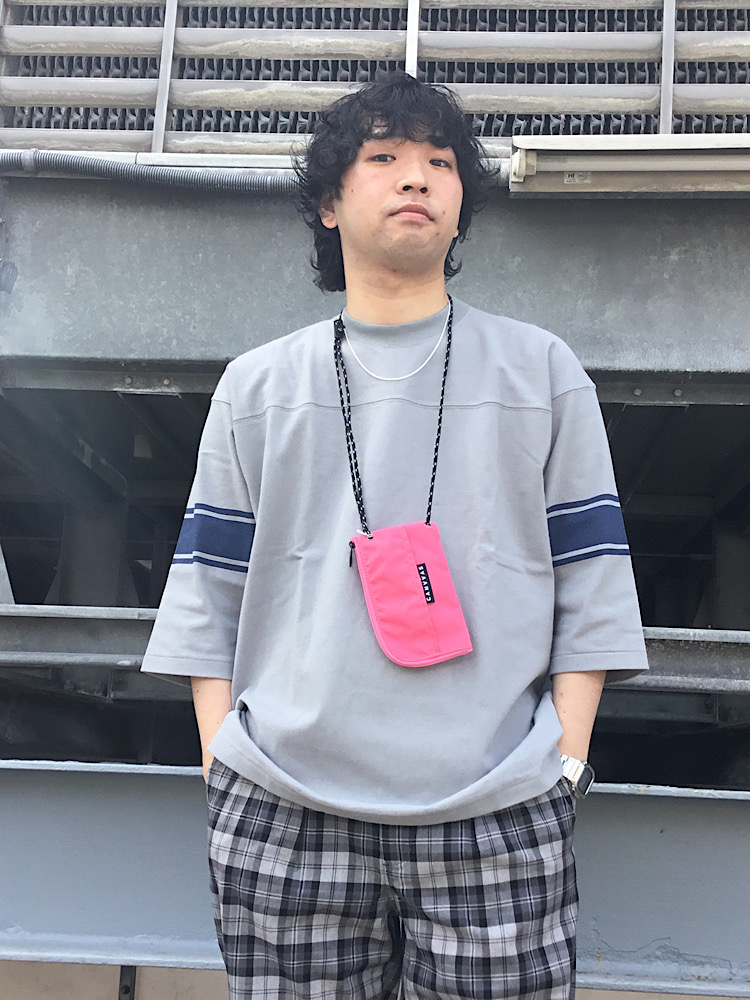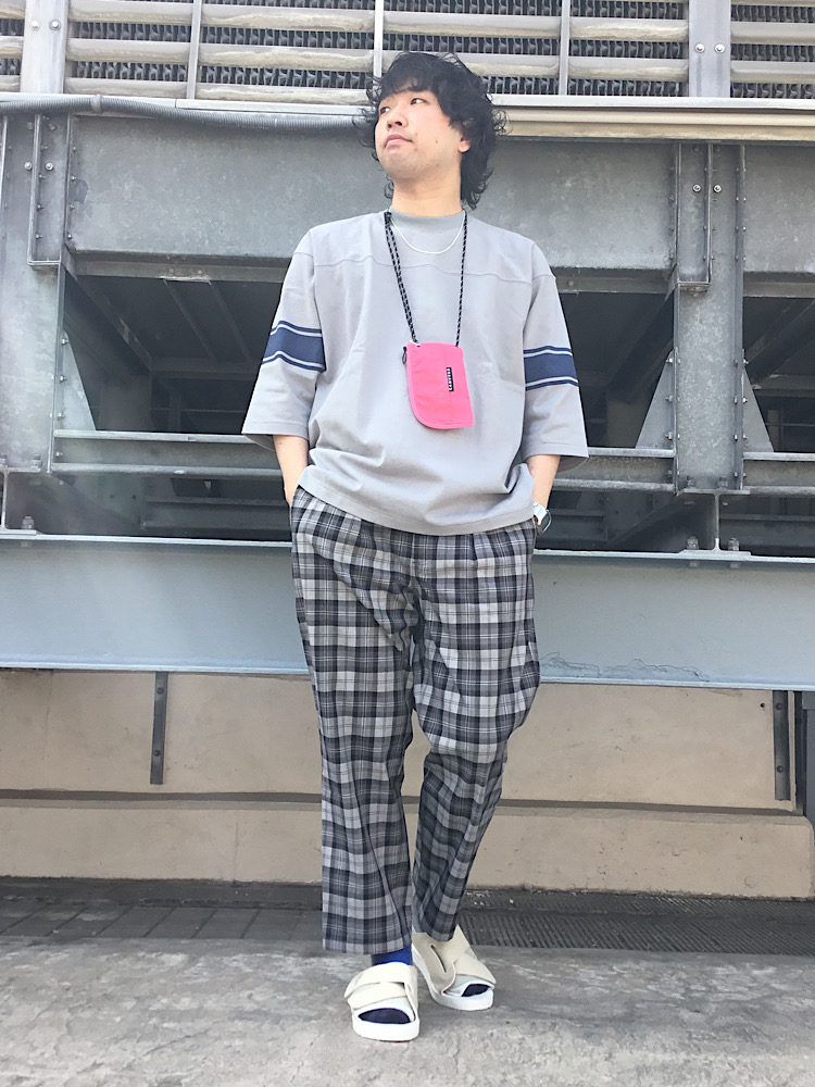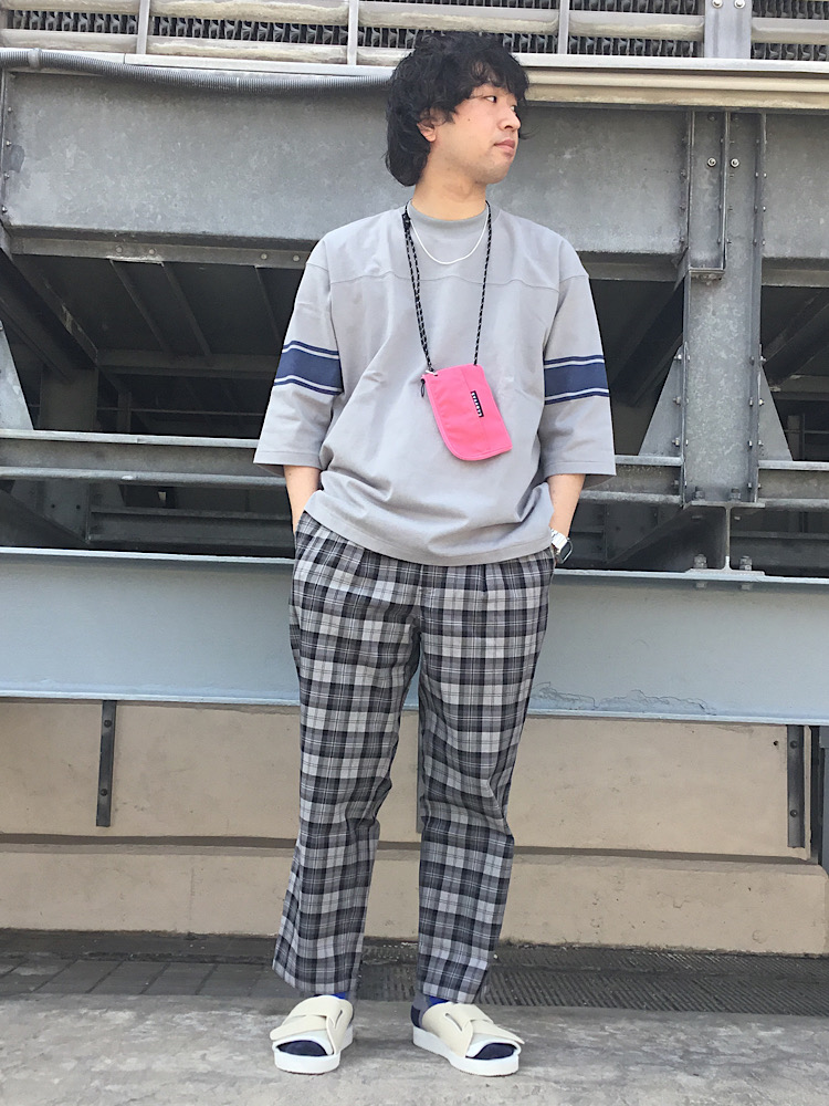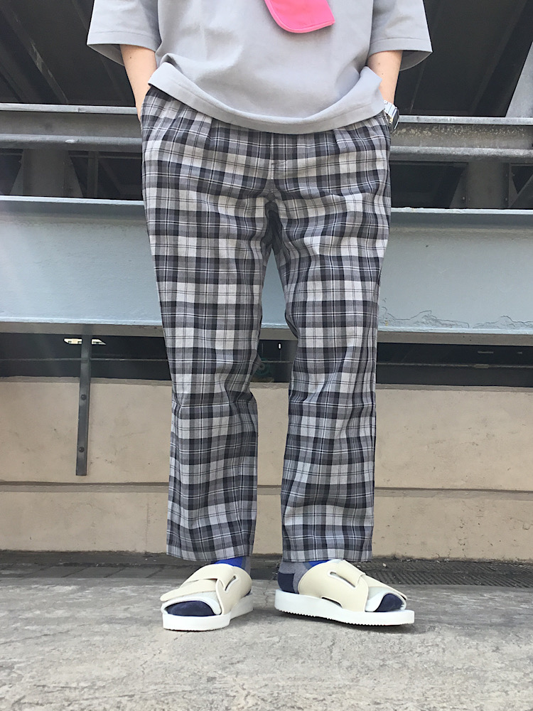 今回は一足早く初夏に向けて新作のフットボールTシャツにKinloch Andersonの生地を別注したチェックパンツを合わせています!