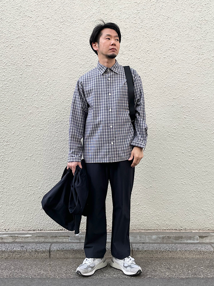 素材感/着心地:ウール100%。ハリのある素材で防シワ、ナチュラルストレッチの機能があります。ウォッシャブルでデイリーに使えるアイテムです。