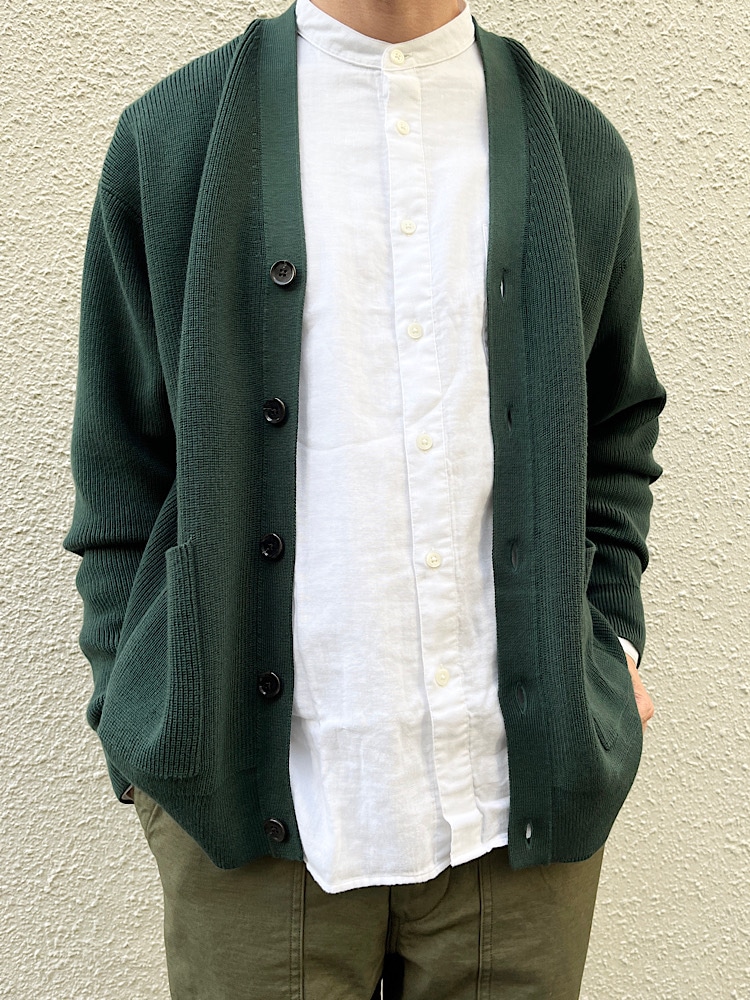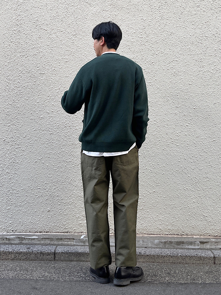 グリーンをベースに定番物でコーディネートしました。中に着た白で軽さを出しました