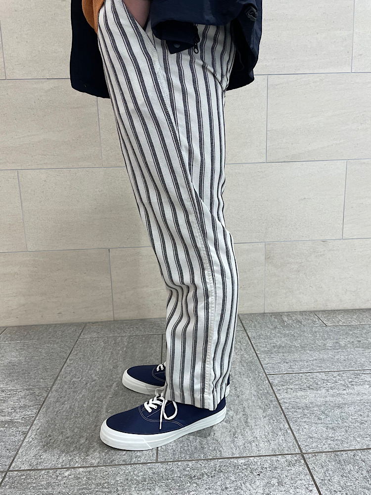 【素材感・着心地】主にポリエステル、コットンで出来ており、サラサラした肌触りが特徴のイージーパンツ。ストライプ柄なので、スタイルが良く見えやすく、ワイドパンツでもキレイに見える。
