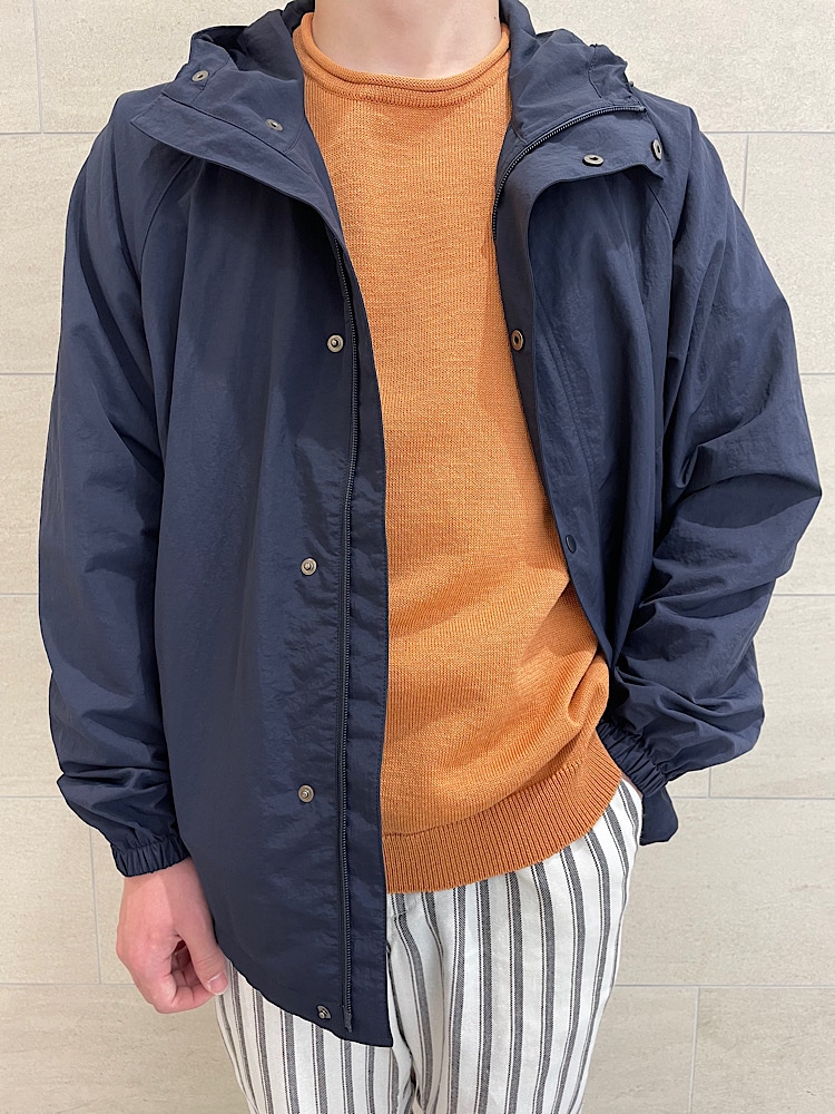 【素材感・着心地】ナイロンで出来たマウンテンパーカー。お腹部分をゴムで縮めてシルエットを細くすることができ、キレイめなスタイリングにも使える商品。