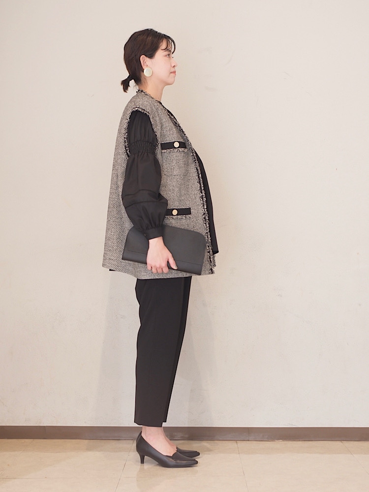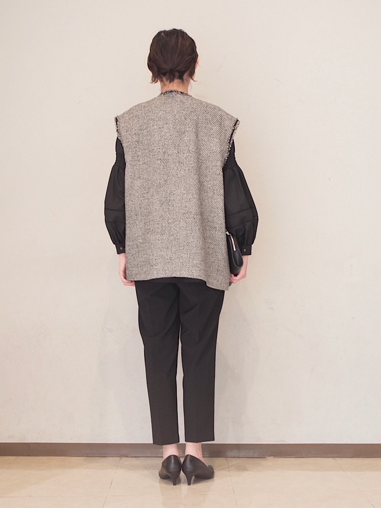 チクチク感の無いツイードで、柔らかな素材感。腰周りが隠れるゆったりな形です。