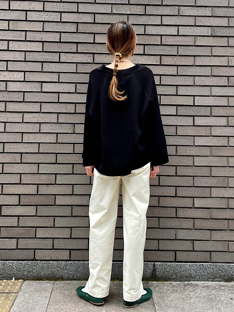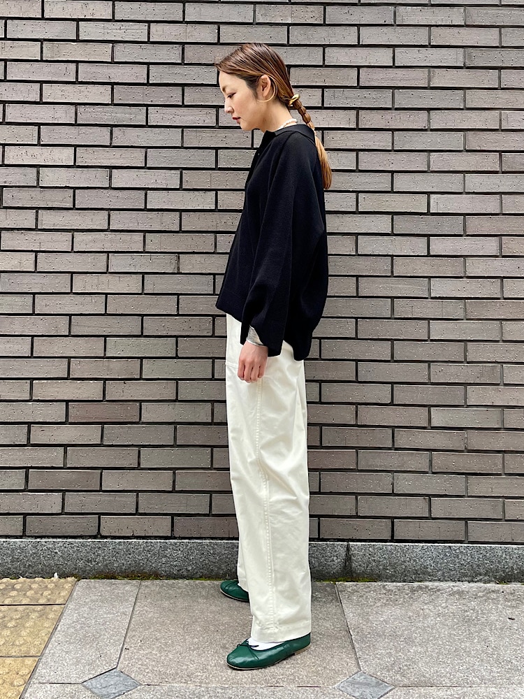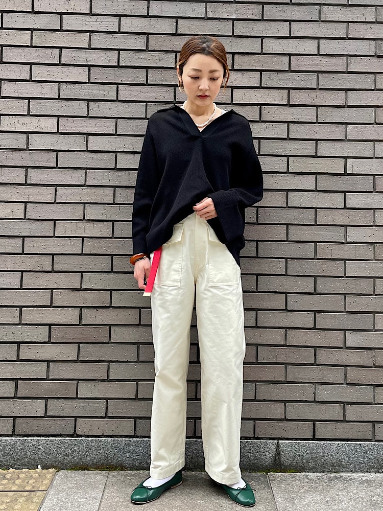 素材感・着心地:薄手のコットン素材。股上が深く、ハイウエストで着用すると脚長効果、ストンとした落ち感を楽しめます。インのスタイルで腰周りのポケットを見せても可愛いです