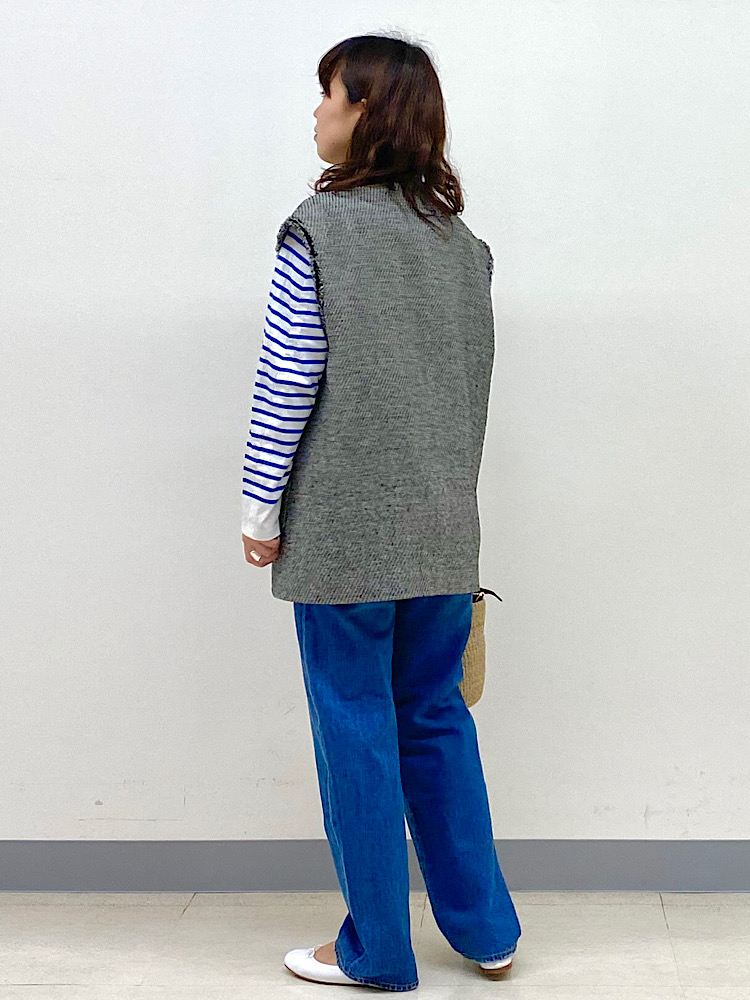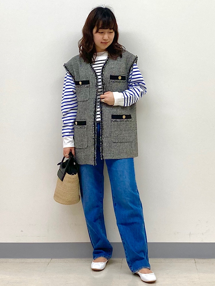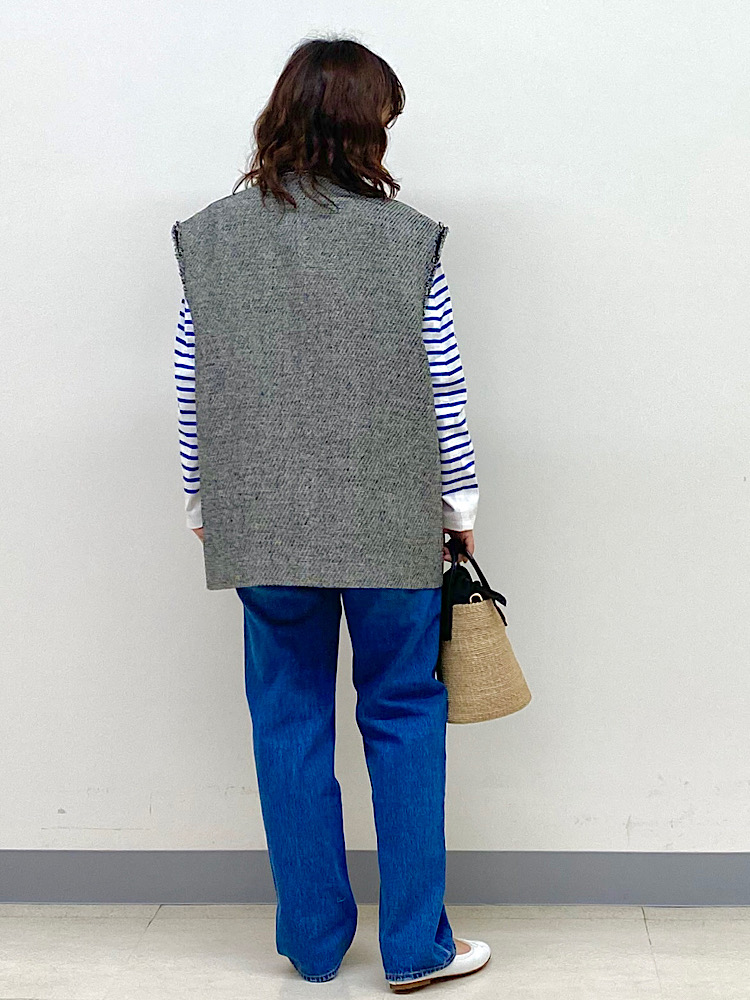 上品な雰囲気のツイードジレには、ボーダー×デニムの王道な組み合わせで普段にも使いやすく。