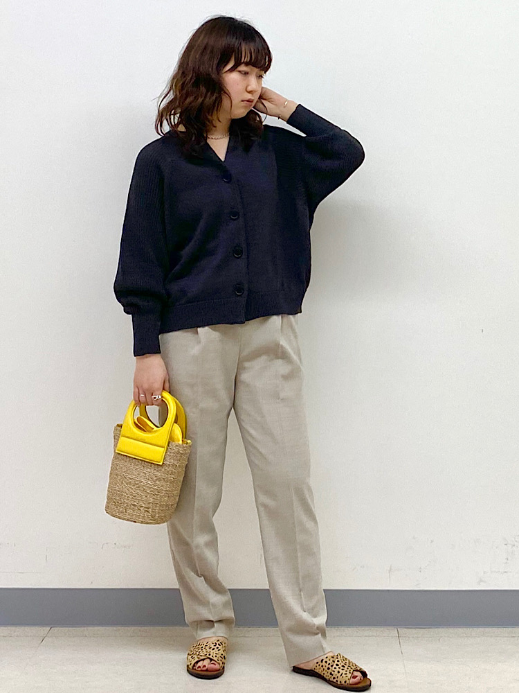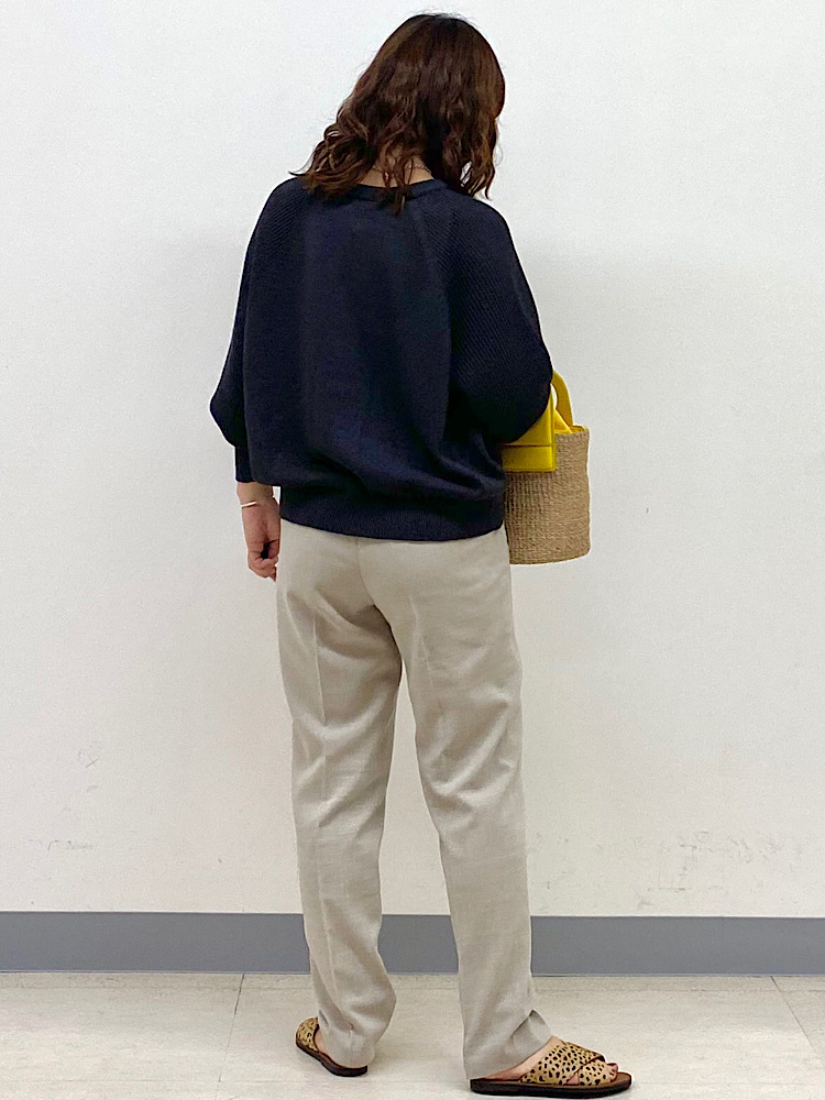 着心地:さらっとしていて肌離れ良く、梅雨時期などにも着られるニット。もちろんボタンを開けて羽織りとしても。