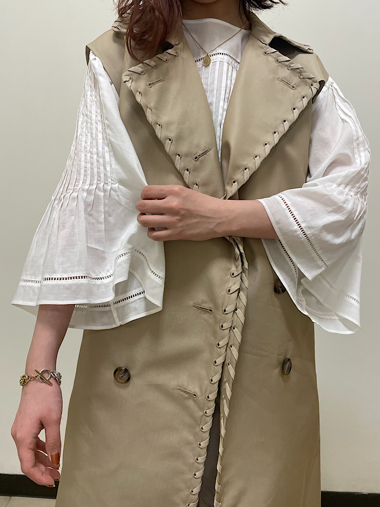 サイズ感:アームホールがゆったりしているので、ボリューム袖のトップスの上からでも羽織りやすいです◎
