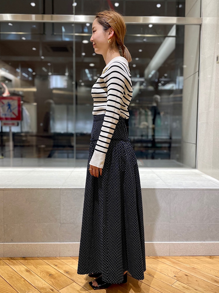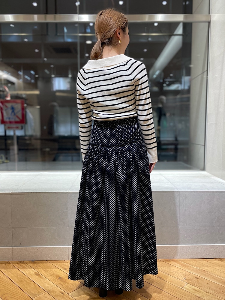 着心地:大人っぽく着れるドット柄スカート。切り替えが見栄えします。
