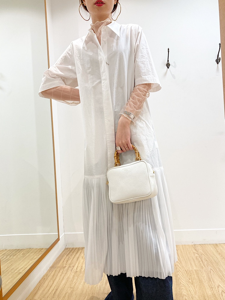 着心地:ハリのあるシャツ生地。裾のプリーツ部分は軽く動きが出ます。