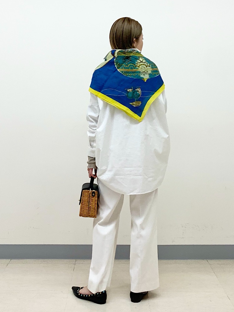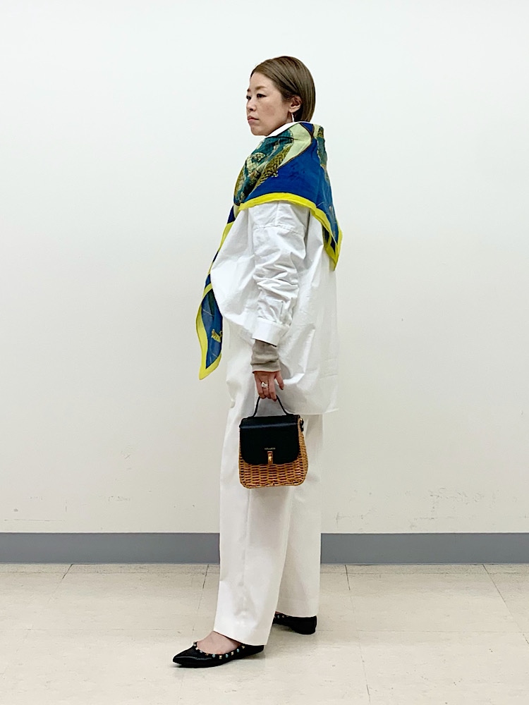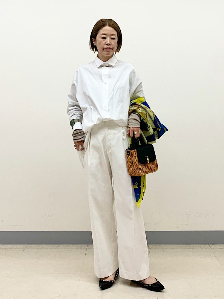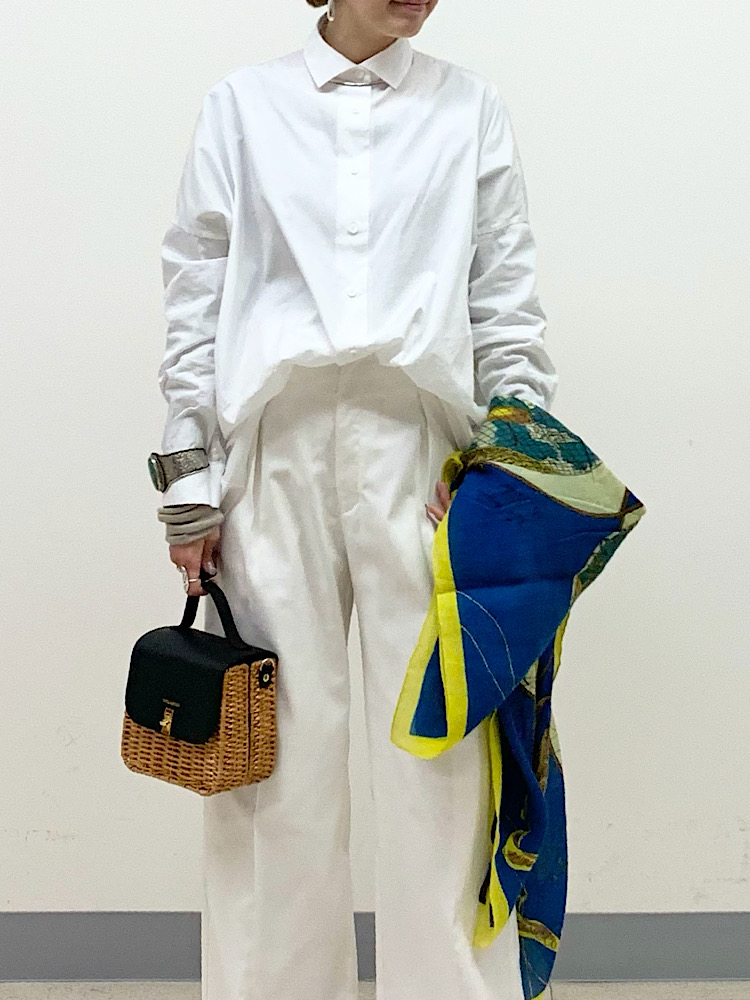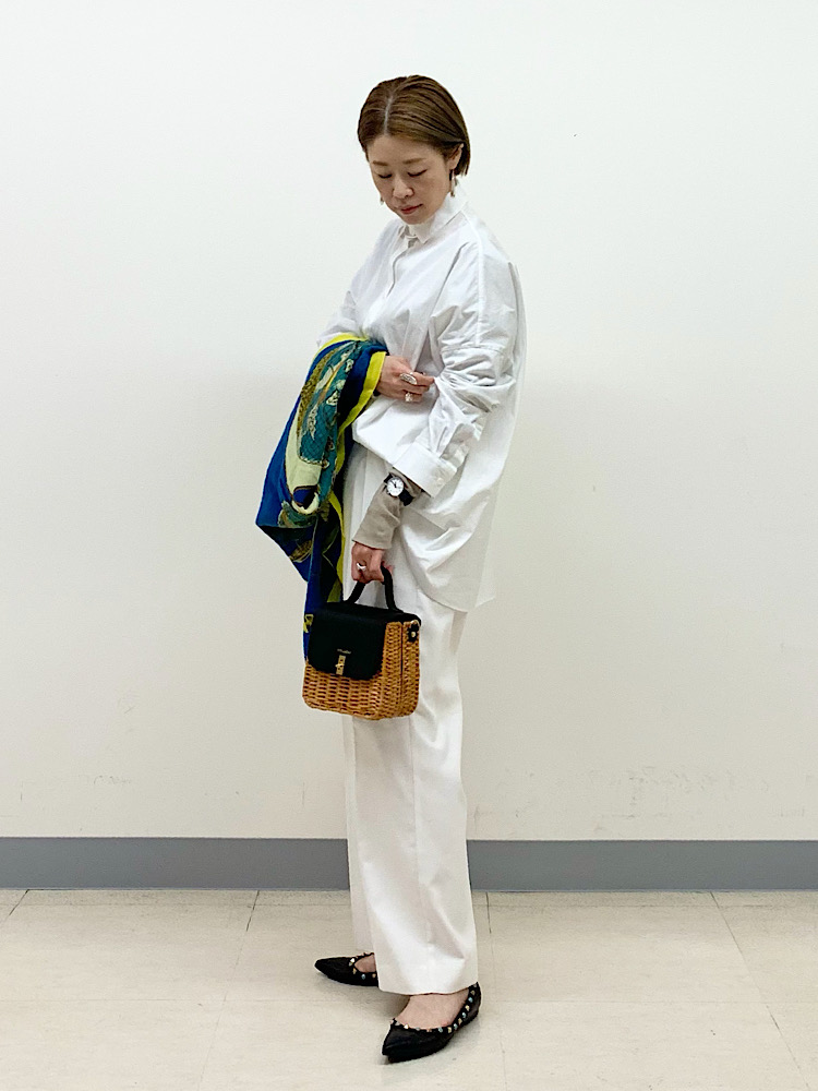 オールホワイトのコーディネートは、小物で引き締めます。白シャツは着こなしで大きく印象を変えられる万能アイテム。