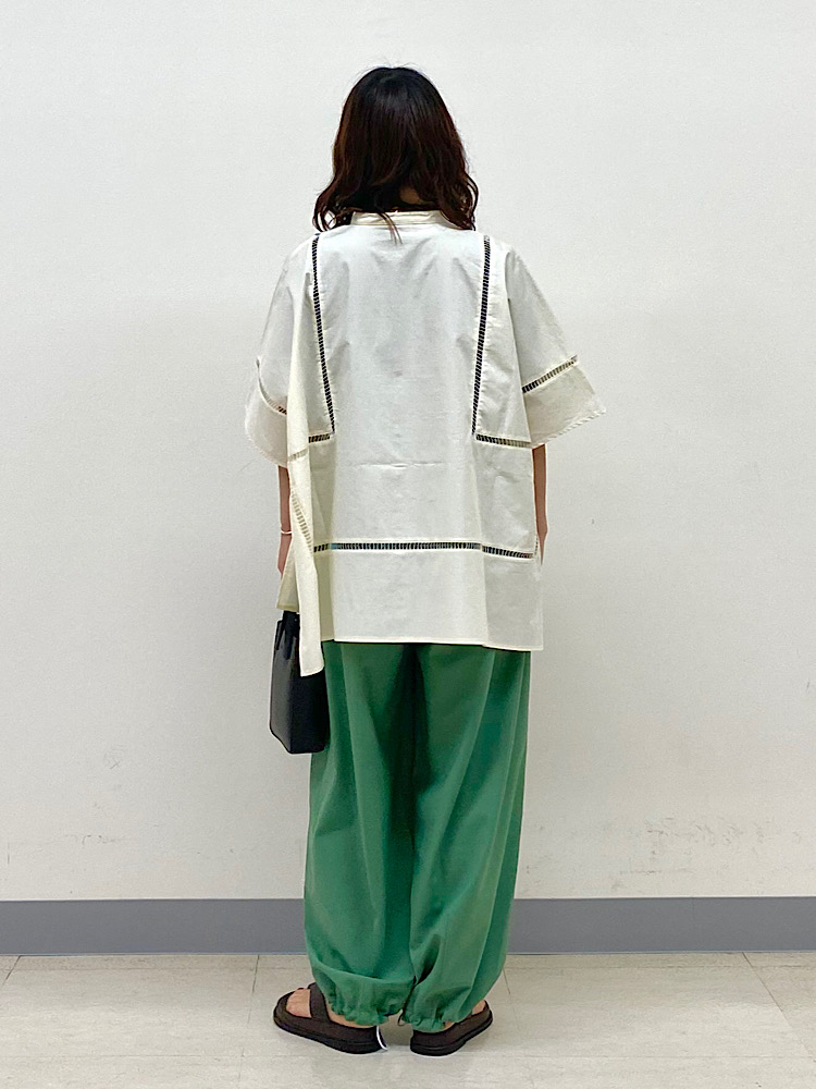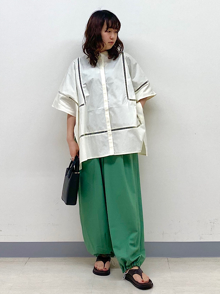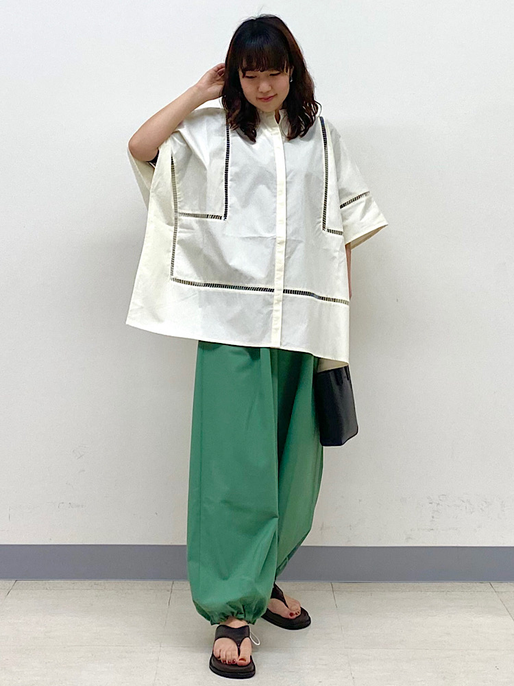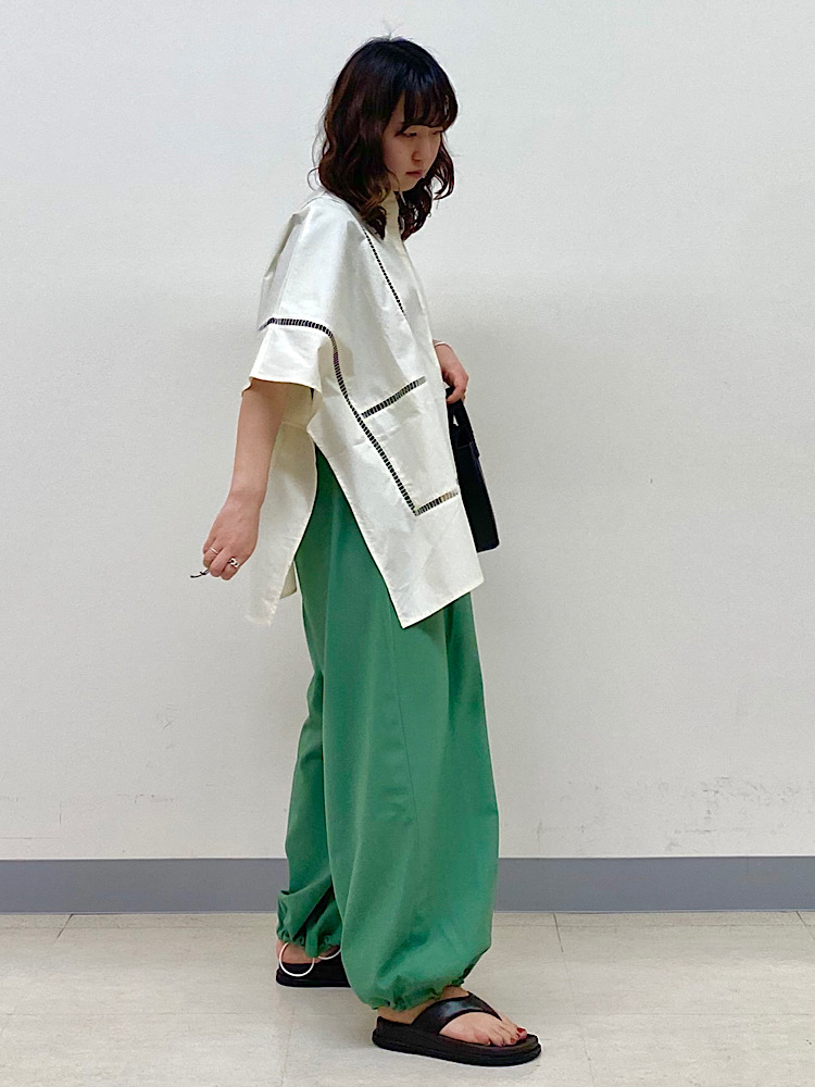 着心地:さらっとしていてハリもある生地。ポンチョのようなシルエットになっているので一枚でも、レイヤードや羽織り使いも。