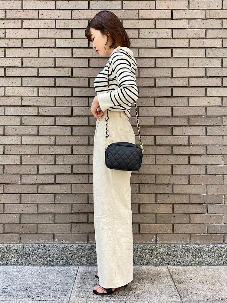 小物はブラックでまとめ、コーディネートにメリハリをつけました