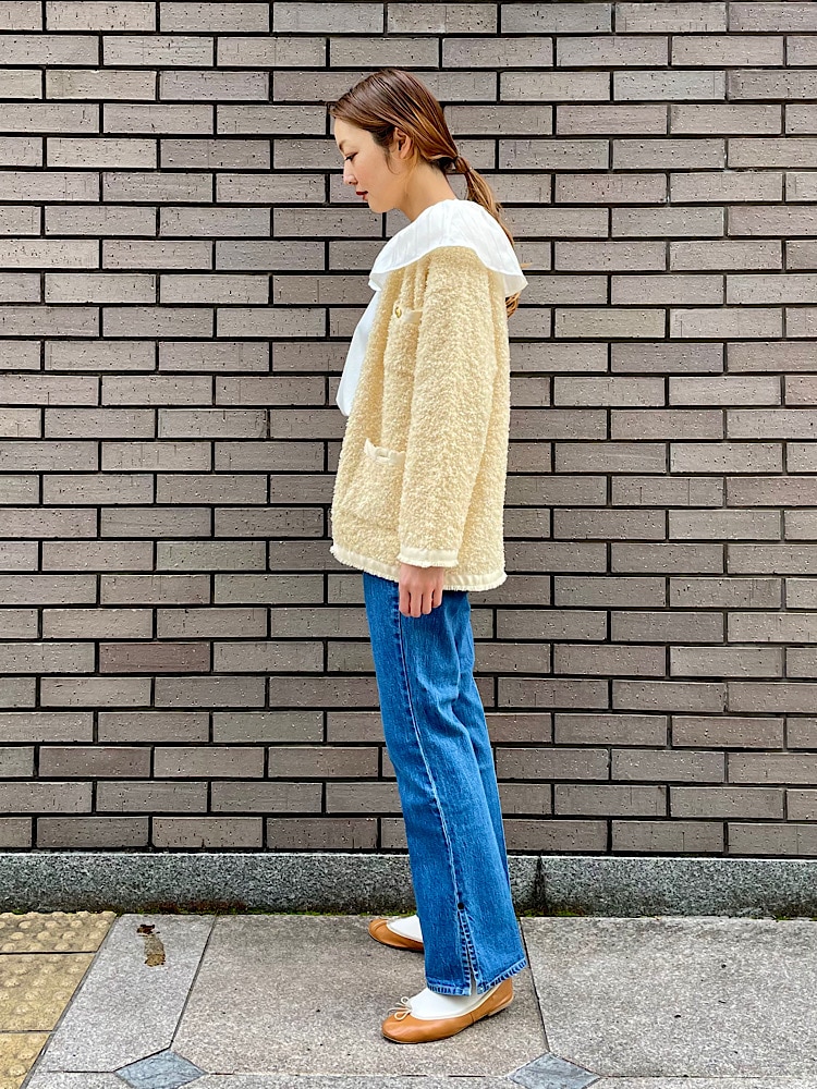 素材感・着心地:ストレッチの効いたデニム素材です。細身で裾がフレアになっています。サイドのスリットもポイントです
