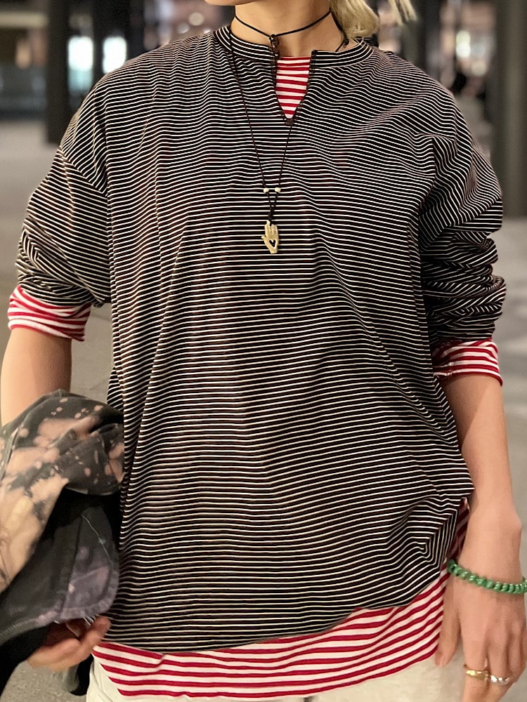 ・着こなしポイント : 首元のVがポイントなので中のインナーで様々な表情をだすことが出来ます。今回はボーダーをプラスしてみました。