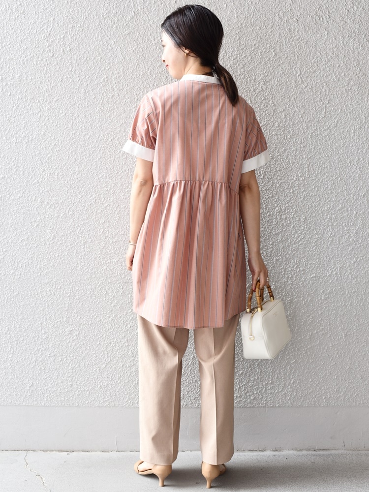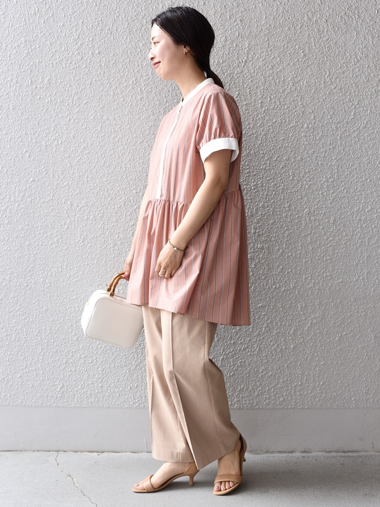 ピンク×ベージュで柔らかく女性らしいコーディネートに。