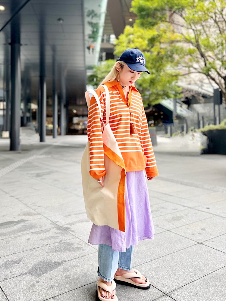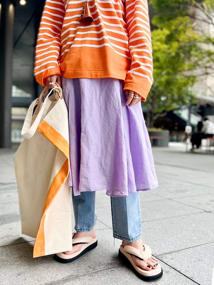 ・着こなしポイント : サンダルで足首あたりをすっきりと見せたかったので、あえてMサイズで少し着丈短めを選びました
