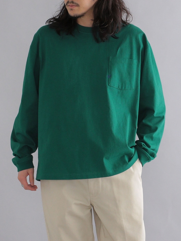 素材感:適度にヘビーウェイトなボディに汗染み防止加工を施し、一枚でも安心して着ていただける生地。