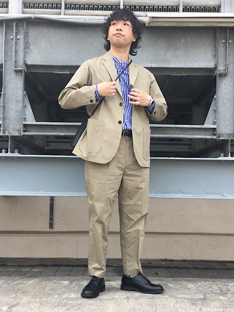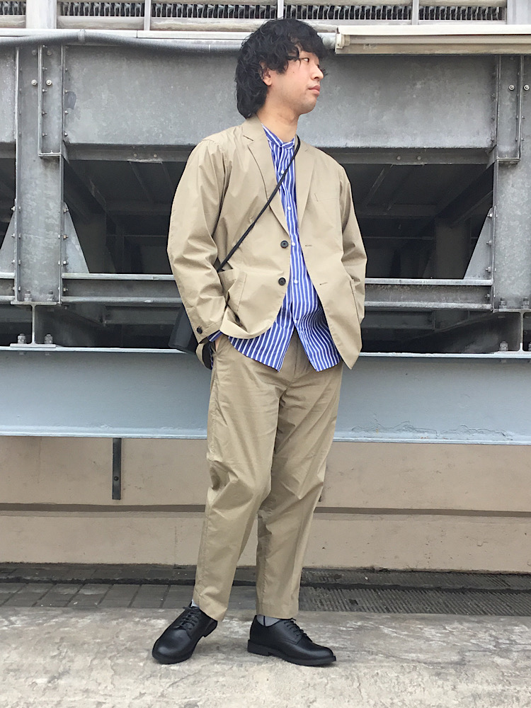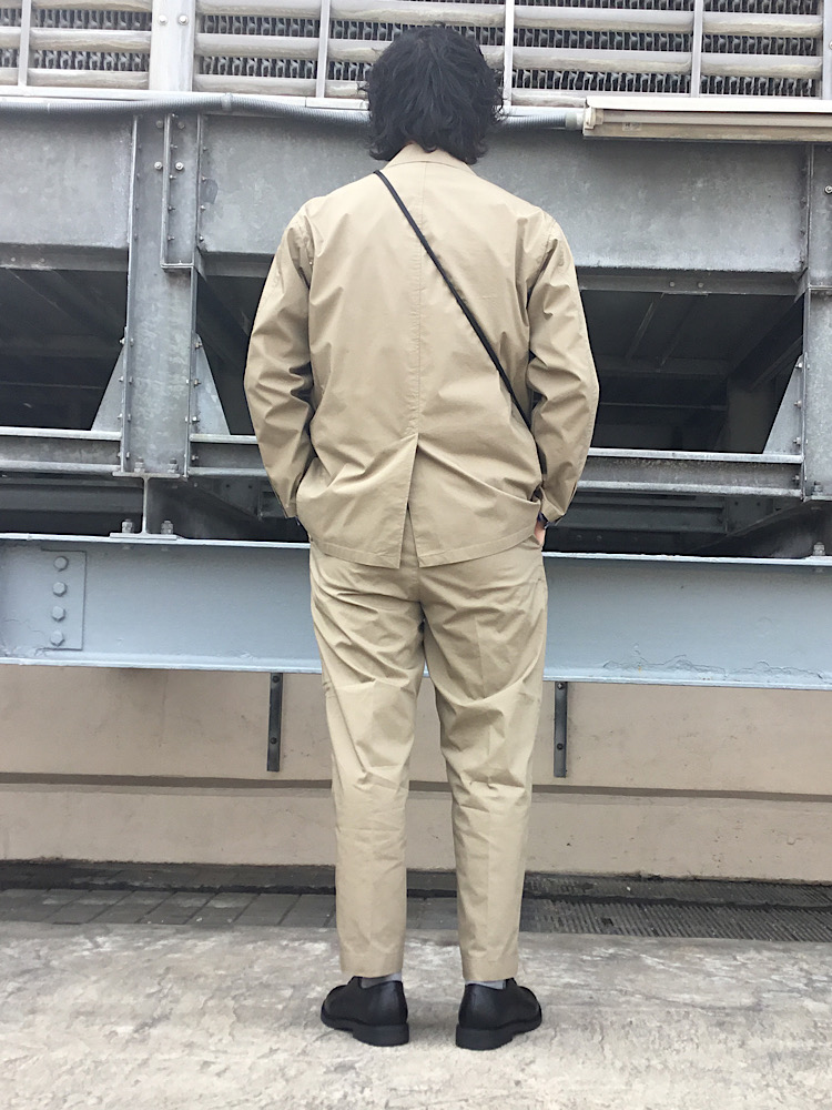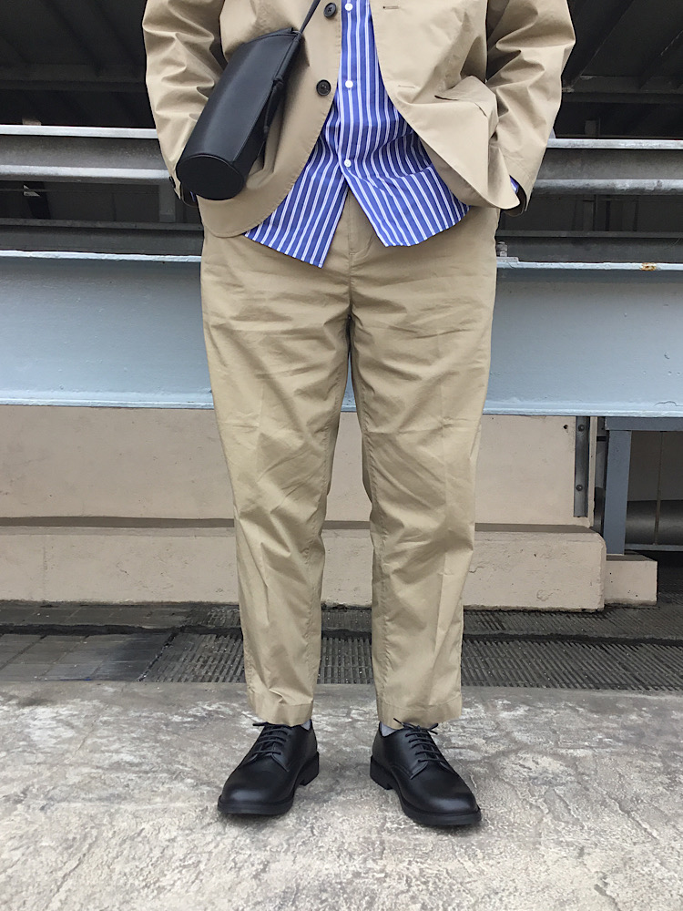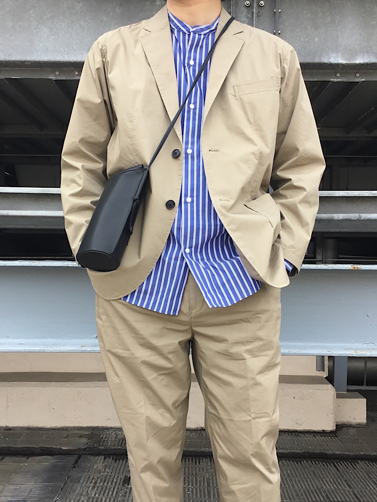 今回は春おすすめのポプリン素材のセットアップにバンドカラーシャツを合わせたコーディネートです。程よくリラックス感がありながら小物や足元をブラックで引き締めてます。