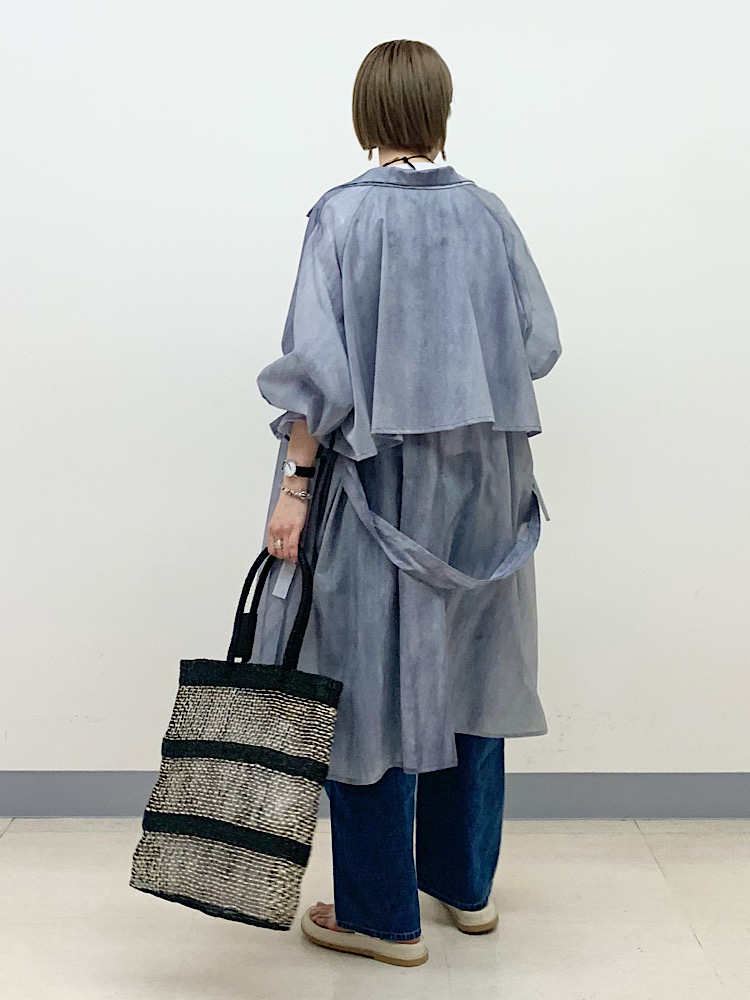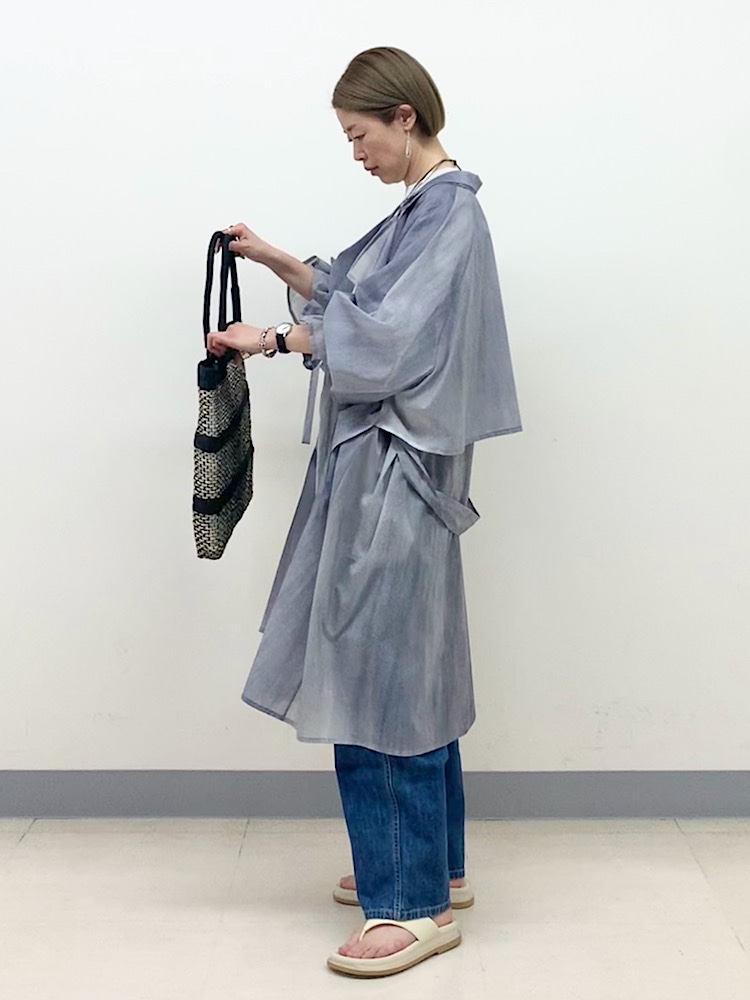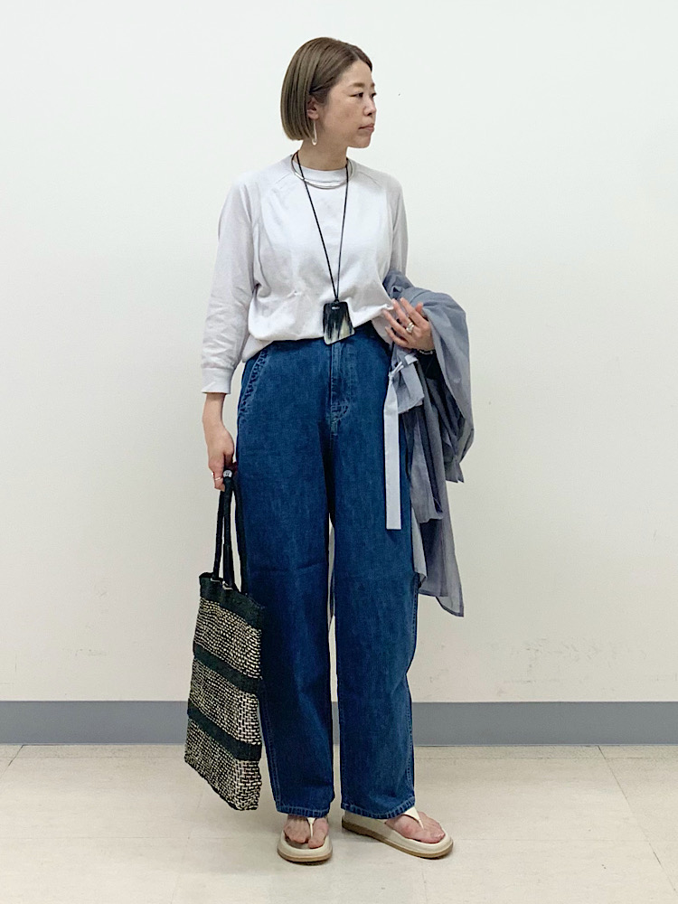 ブルーグレーのトーンでまとめたクールなスタイリング。ゾウリサンダルで足元に抜け感をプラス。